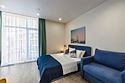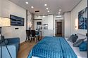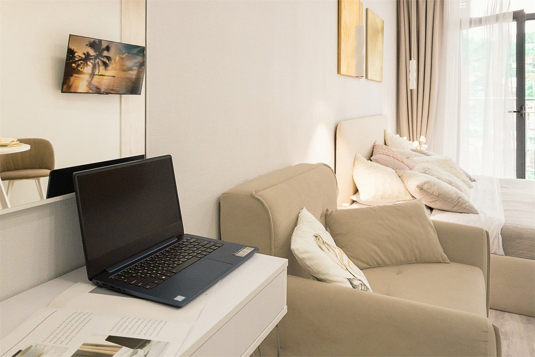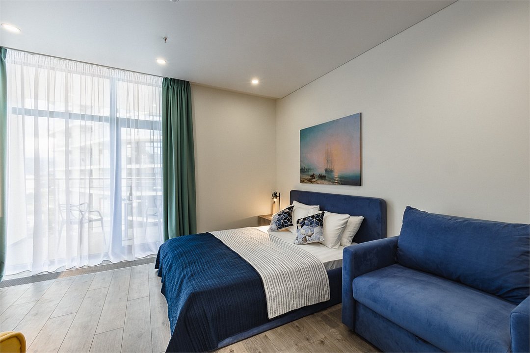 Апартаменты-студия площадью 35 м2 на 12 этаже. Расположенные по адресу: г. Алушта, ул. Западная, д.4, к2 они обладают прекрасным видом на море, которым можно наслаждаться, расслабившись на уютном балконе. Основное спальное место представлено двуспальной кроватью с пружинным матрасом. Также в апартаментах имеется кресло-кровать, что позволяет разместить до 3х гостей без каких-либо неудобств.Услуги и удобства