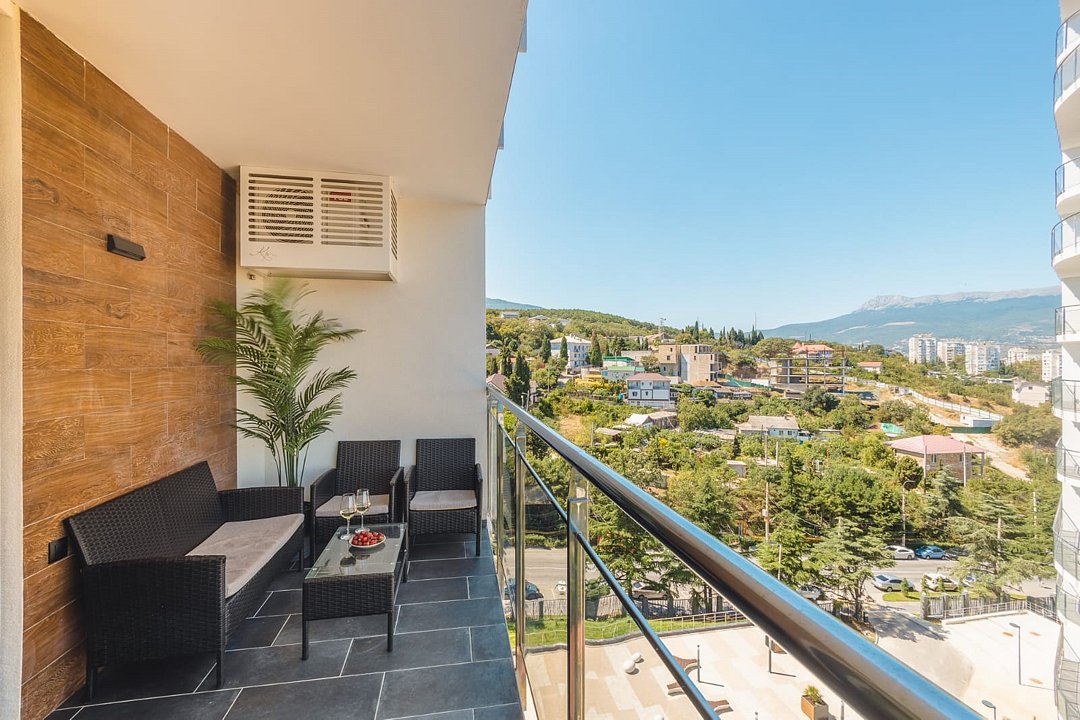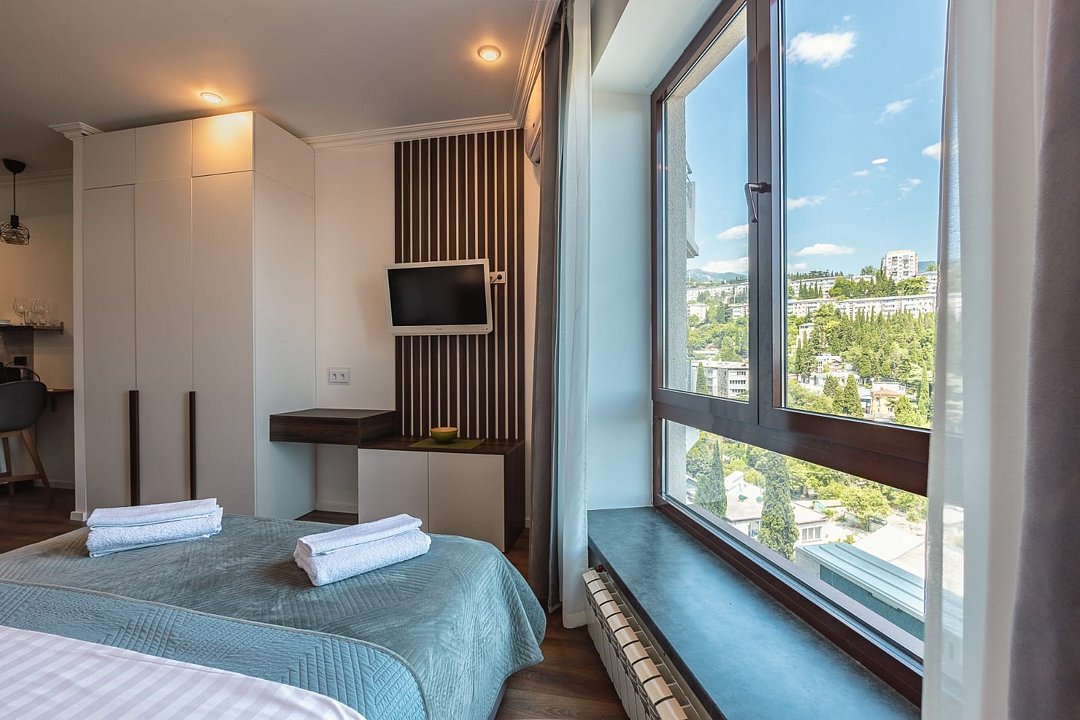 Апартамент-студия площадью 26 м2 на 6 этаже. Расположенные по адресу: г. Алушта, ул. Западная, д.4, они обладают прекрасным видом на горы, которым можно наслаждаться, расслабившись на уютном балконе. Основное спальное место представлено двуспальной кроватью. Также в апартаментах имеется кресло-кровать, что позволяет разместить до 3 гостей без каких-либо неудобств.Услуги и удобства