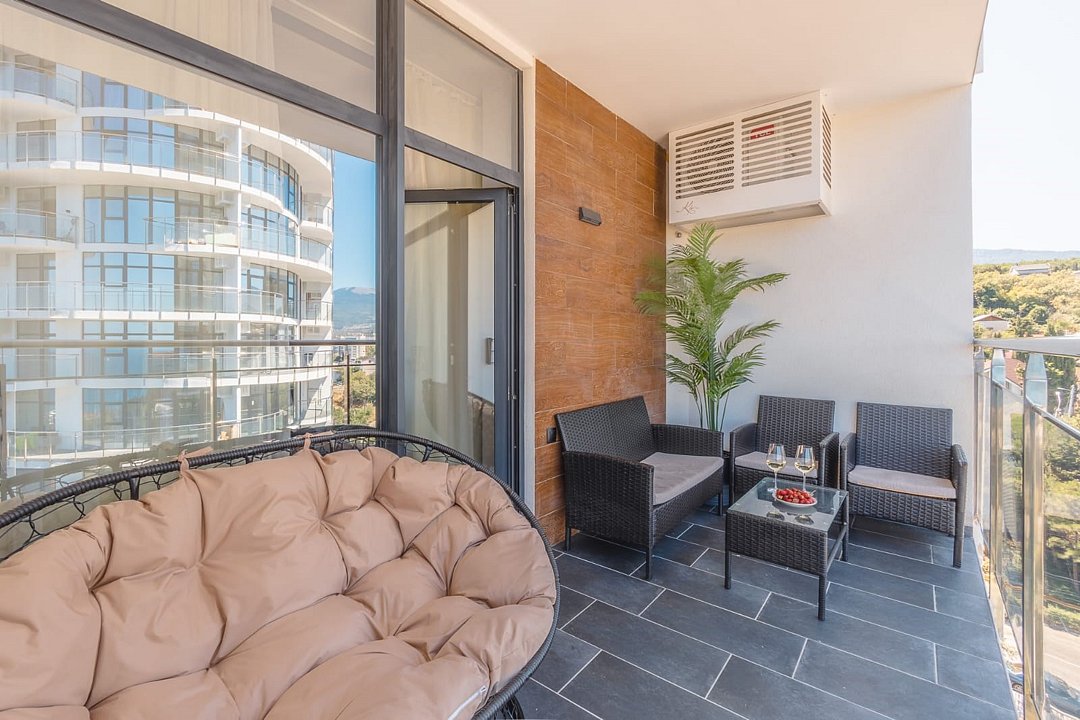 Wi-Fi, интернет, холодильник, кондиционер, фен, плита для приготовления пищи, микроволновая печь, утюг, душевая кабина, санузел, халаты, банные полотенца, тапочки, двуспальная кровать, гладильная доска, шкаф для одежды, обеденный стол, зеркало, кухня, набор посуды, стиральная машина, чайник, мягкая мебель, кухонная посуда, стаканы, столовые приборы, сушилка для белья, раскладное кресло, шкаф-купе, гостиничная парфюмерия, вид на горы, телевизор со Smart TV, балкон с боковым видом на море, кресло-кровать, без питомцевВ апартаментах