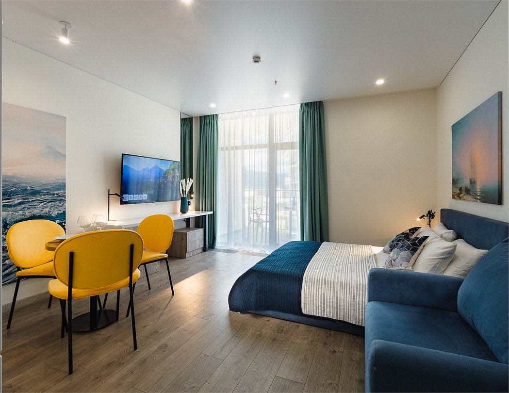 Апартамент-студия площадью 37 м2 на 7 этаже. Расположенные по адресу: г. Алушта, ул. Западная, д.4, они обладают прекрасным видом на море и горы, которым можно наслаждаться, расслабившись на уютном балконе. Основное спальное место представлено двуспальной кроватью. Также в апартаментах имеется кресло-кровать, что позволяет разместить до 3 гостей без каких-либо неудобств.Услуги и удобства