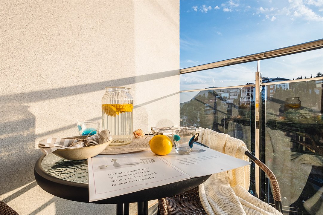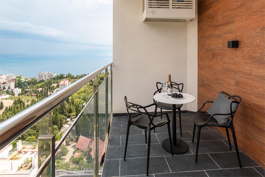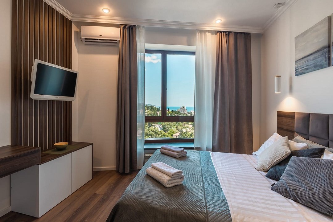 Wi-Fi, холодильник, кондиционер, фен, микроволновая печь, утюг, душевая кабина, халаты, банные полотенца, тапочки, балкон с красивым видом, двуспальная кровать, гладильная доска, шкаф для одежды, обеденный стол, зеркало, кухня, набор посуды, стиральная машина, чайник, кухонная посуда, стаканы, столовые приборы, туалет, сушилка для белья, раскладное кресло, гостиничная парфюмерия, вид на горы, телевизор со Smart TV, балкон с боковым видом на море, кресло-кровать, вешалки-плечики, затемняющая штора, без питомцевВ апартаментах