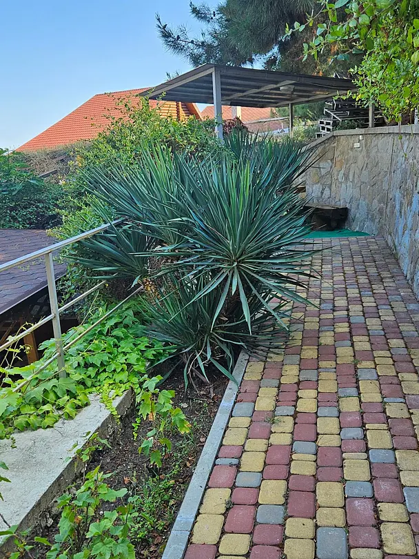 Заведение понравится гостям своей великолепной территорией – с множеством субтропических насаждений, цветов, фонтанчиков и альпийских горок, а еще небольших скульптур, от которых будут в восторге дети. Среди этой красоты разместилась площадка для шашлыков, небольшая терраса для отдыха и игровая зона.