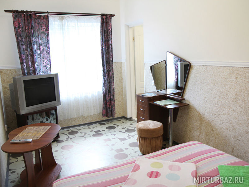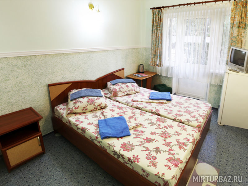 Двухкомнатный номер. В первой комнате две односпальные кровати, телевизор, кабельное телевиденье, холодильник, кондиционер.