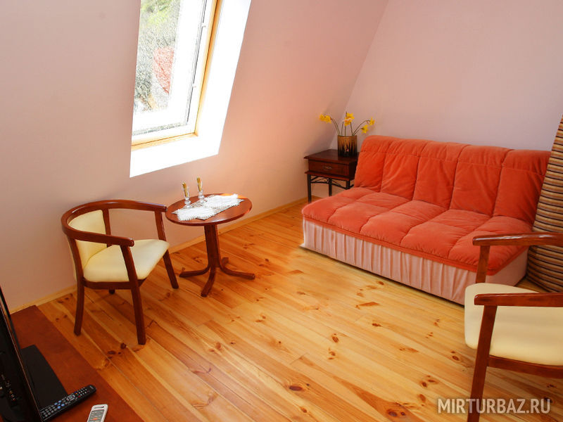 Двухкомнатный номер мансардного типа. Расположен на четвертом мансардном этаже