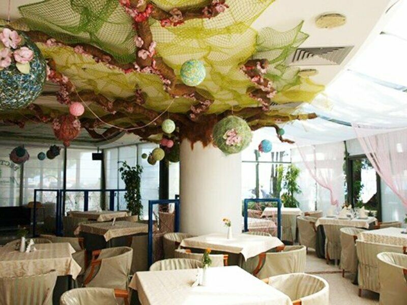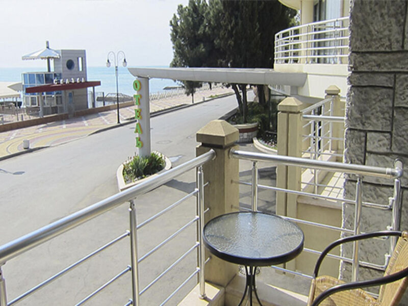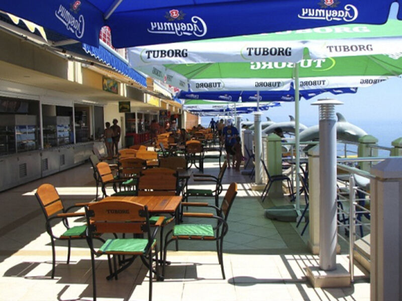 Теперь о минусах (достаточно специфических). Я передвигаюсь на коляске, поэтому отмечаю то, на что подавляющее большинство туристов не обратит внимания, а именно - пандус при входе в отель хоть и маленький, но крутой и требует перестройки в соответствии со СНиПом. Пляж отеля для колясочников недоступен - полуметровые ступеньки при входе и выходе с крутого спуска, и хотя персонал готов в любой момент вас спустить-поднять, это, конечно, не дело. Мы вышли из положения, договорившись с отелем "Сказка", пляж которого имеет "второй этаж" - солярий и находится прямо перед входом в отель "Аквапарк".