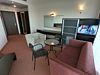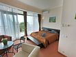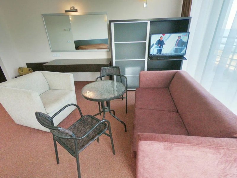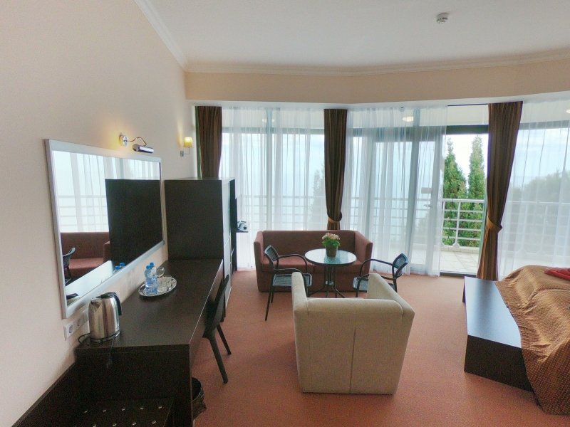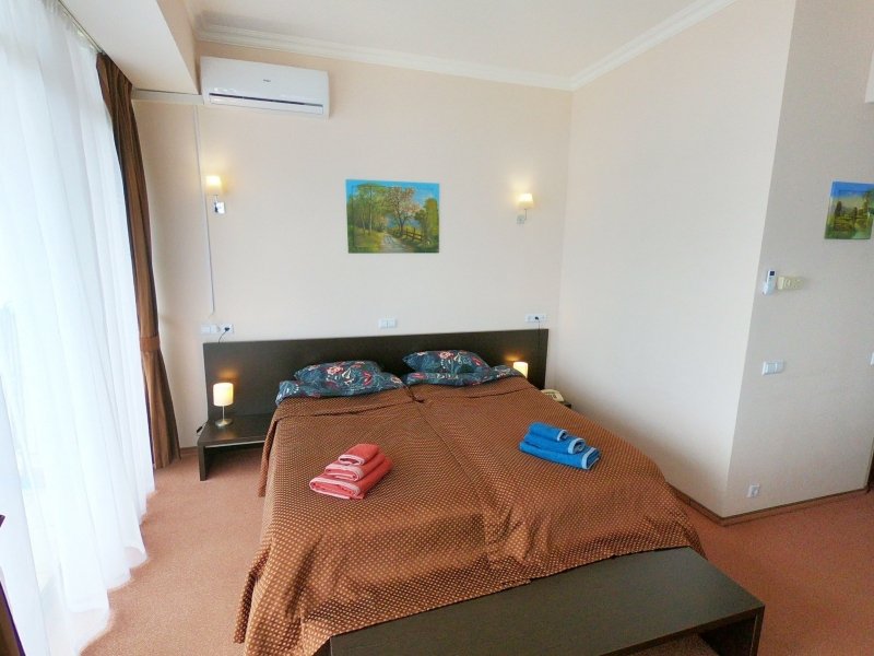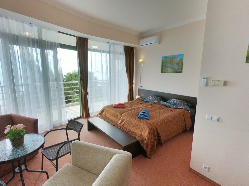 Панорамный 2-х местный однокомнатный номер. От входа номер расширяется и переходит в панорамный эркер, выходящий на балкон, позволяющий насладиться видом на море в обе стороны. Номер очень светлый и воздушный, площадью 37 кв.м. Спальные места представлены двуспальной кроватью системы Twin (возможно разделить на 2 односпальные кровати) и раскладным диваном. В номере будет комфортно романтичным семейным парам и семьям с 1 ребенком. Пляж: Море находится в 10 метрах. Посещение любого пляжа на побережье свободно, а услуги на нем предоставляются на усмотрение администрации пляжа !
