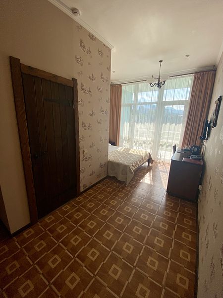 Однокомнатный семейный номер с прихожей, санузлом и балконом. в номере диван-кровать 1,5 спальный. Есть возможность расположить раскладное кресло или детскую кроватку.