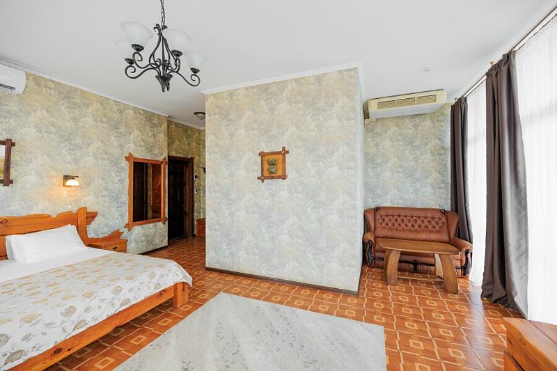 В номере: двуспальная кровать (1800х2000 см), шкаф для одежды, журнальный столик, прикроватные тумбы, стол, стул, посуда, электрочайник, сейф, холодильник, телефон, LCD телевизор, кондиционер, гладильные принадлежности, балкон с мебелью.