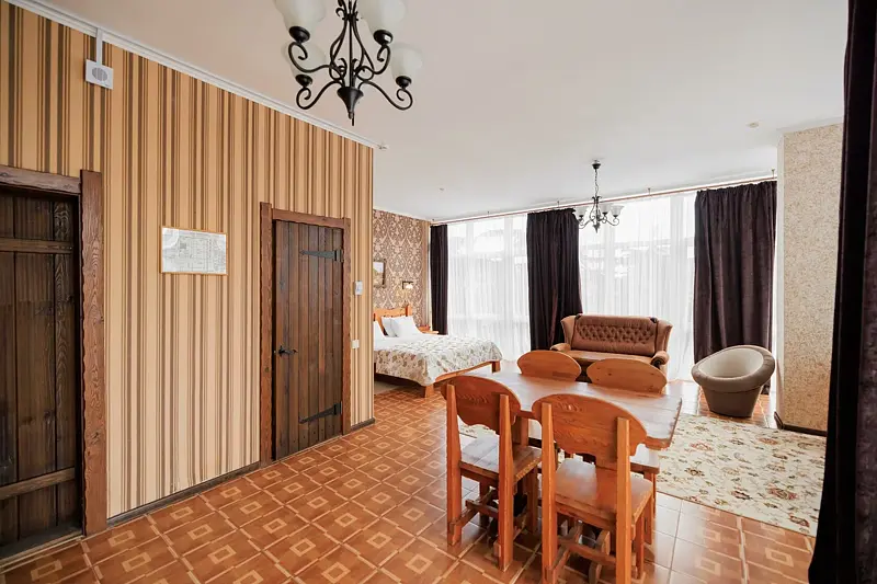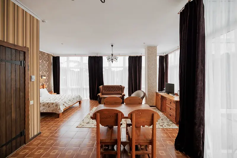 Номер — 45 кв.м с удобствами (совмещенный санузел с ванной, тапочки, туалетные принадлежности, фен, 2 халата).