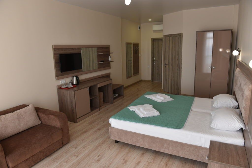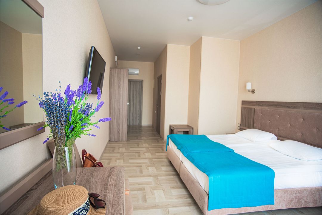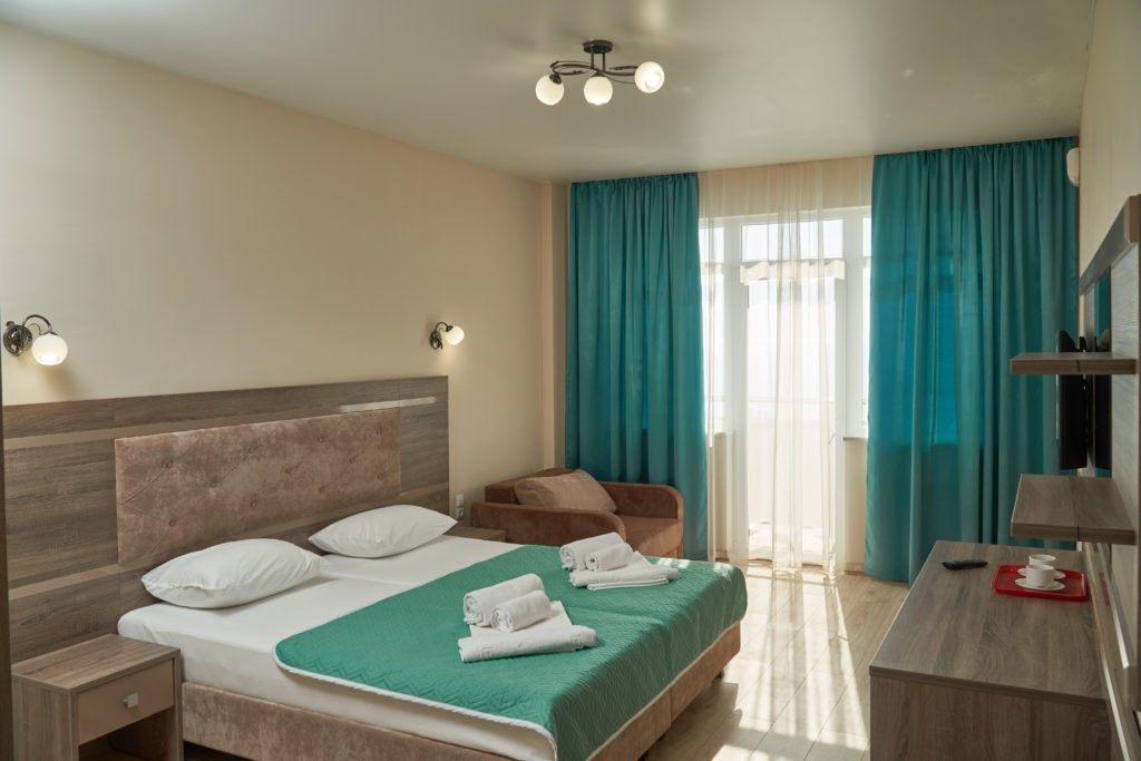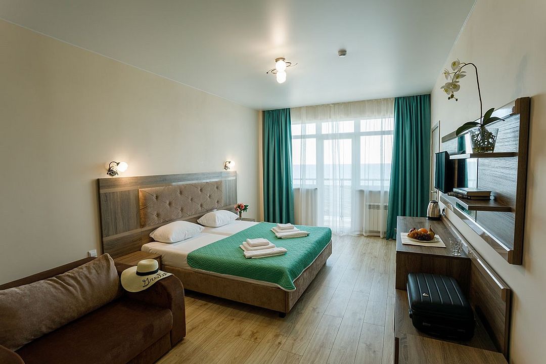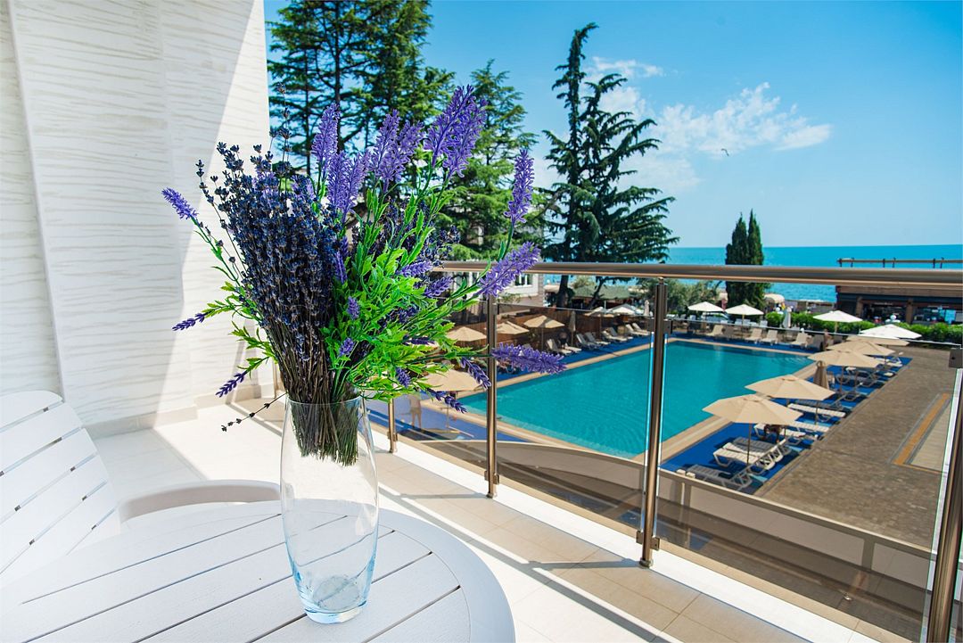 Комфортные двухкомнатные номера, состоящие из спальни и гостинной, номера с балконом. Номера могут быть с видом на море, а так же без вида на море (видом на территорию отеля , на город). Номера оснащены всем необходимым для отдыха. Для вашего удобства балкон оснащен столом и стульями. Площадь номеров от 35 кв.м. Во всех номерах есть: одна двуспальная, раскладной диван и раскладное кресло, кондиционер, кабальное телевиденье и Wi-Fi, мини-бар, чайный набор, сушилка для белья, сейф, банные и пляжные полотенца, халаты, тапочки. Размещение: 2 человека, 2 доп. места Номера категории "Люкс" расположены в первом и во втором корпусе Обращаем Ваше внимание, что этаж и тип кроватей предоставляется при заселении в отель в зависимости от наличия свободных номеров и заранее не гарантируется. Возможен вариант с боковым видом на море. Гарантировать прямой вид на море отель не может, так как номера присваиваются в день заселения. Для детей до 3 лет (по наличию) предоставляются детские кроватки.Услуги и удобства