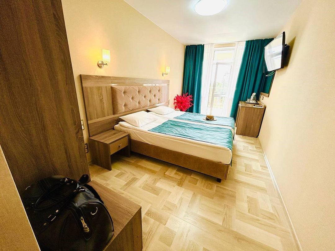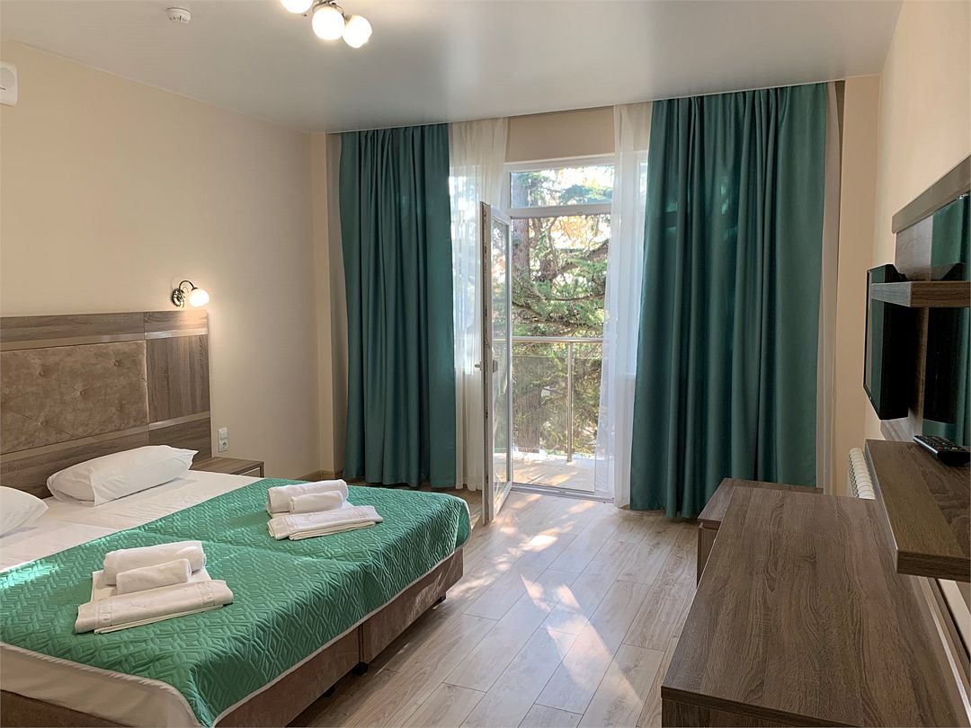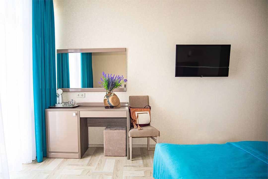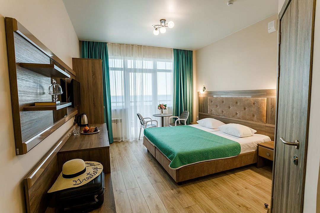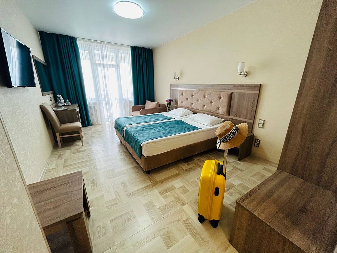 Комфортные двухкомнатные номера, состоящие из спальни и гостинной, номера с балконом. Номера могут быть с видом на море, а так же без вида на море (видом на территорию отеля , на город). Номера оснащены всем необходимым для отдыха. Для вашего удобства балкон оснащен столом и стульями. Площадь номеров от 35 кв.м. Во всех номерах есть: одна двуспальная, раскладной диван и раскладное кресло, кондиционер, кабальное телевиденье и Wi-Fi, мини-бар, чайный набор, сушилка для белья, сейф, банные и пляжные полотенца, халаты, тапочки. Размещение: 2 человека, 2 доп. места Номера категории "Люкс" расположены в первом и во втором корпусе Обращаем Ваше внимание, что этаж и тип кроватей предоставляется при заселении в отель в зависимости от наличия свободных номеров и заранее не гарантируется. Возможен вариант с боковым видом на море. Гарантировать прямой вид на море отель не может, так как номера присваиваются в день заселения. Для детей до 3 лет (по наличию) предоставляются детские кроватки.Услуги и удобства