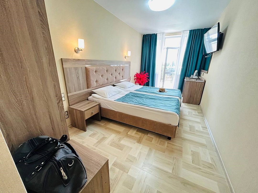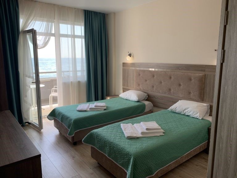Уютные просторные номера отеля "Русалма" с видом на Черное море в первом корпусе оснащены всем необходимым для вашего комфортного незабываемого отдыха. Номера с французскими балконами и обычными балконами. Для вашего комфорта балкон оснащен столом и стульями. Здесь можно встречать рассветы или мечтать о чем угодно с чашкой чая или кофе в руках. Балкон дает возможность насладиться панорамным видом прямо из номера. Площадь номеров от 18 кв.м. Во всех номерах есть: две односпальных кровати (указать при бронировании), кондиционер, кабельное телевиденье и Wi-Fi, мини-бар, чайный набор, сушилка для белья, сейф, банные и пляжные полотенца. Размещение: 2 человека, 1 доп. место. Обращаем Ваше внимание, что этаж тип кроватей и балконов предоставляется при заселении в отель в зависимости от наличия свободных номеров и заранее не гарантируется. Для детей до 3 лет (по наличию) предоставляются детские кроватки.Услуги и удобства