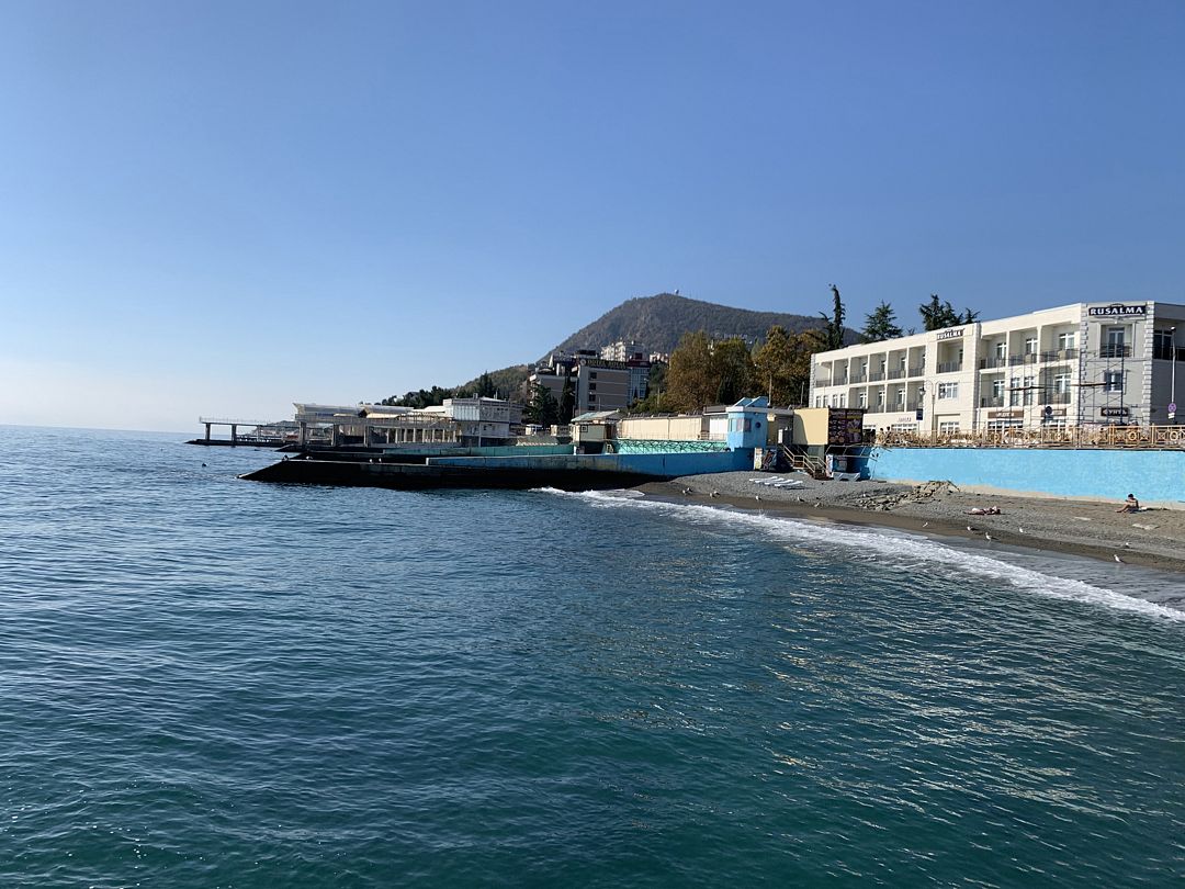 Есть свой пляж, на который как мы поняли мог попасть каждый, иначе сложно объяснить такое количество людей. По расположению единственный минус это то, что отель находится далеко от главной набережной алушты (около 25 минут пешком), но своя набережная тоже в целом неплохая. -