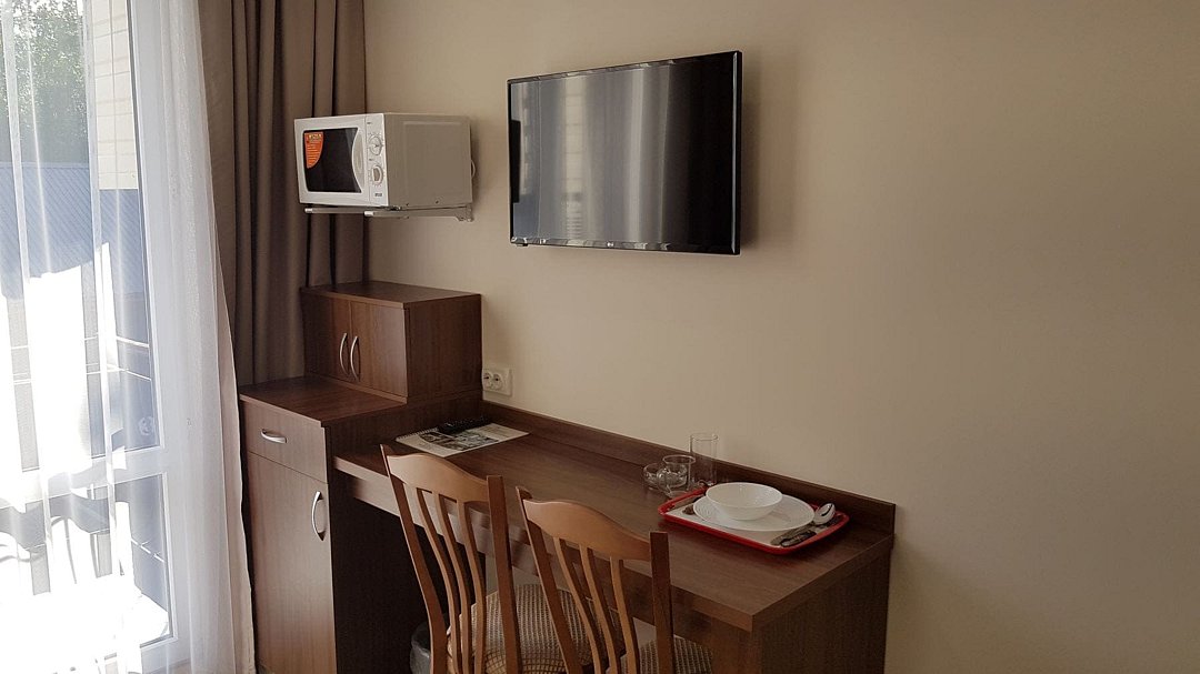 К вашим услугам: диван-кровать, кондиционер, телевизор, холодильник, микроволновая печь, чайник, набор посуды, сейф, тапочки. С/у с душевой кабинкой, фен, гигиенические наборы, мыло, гель, шампунь.