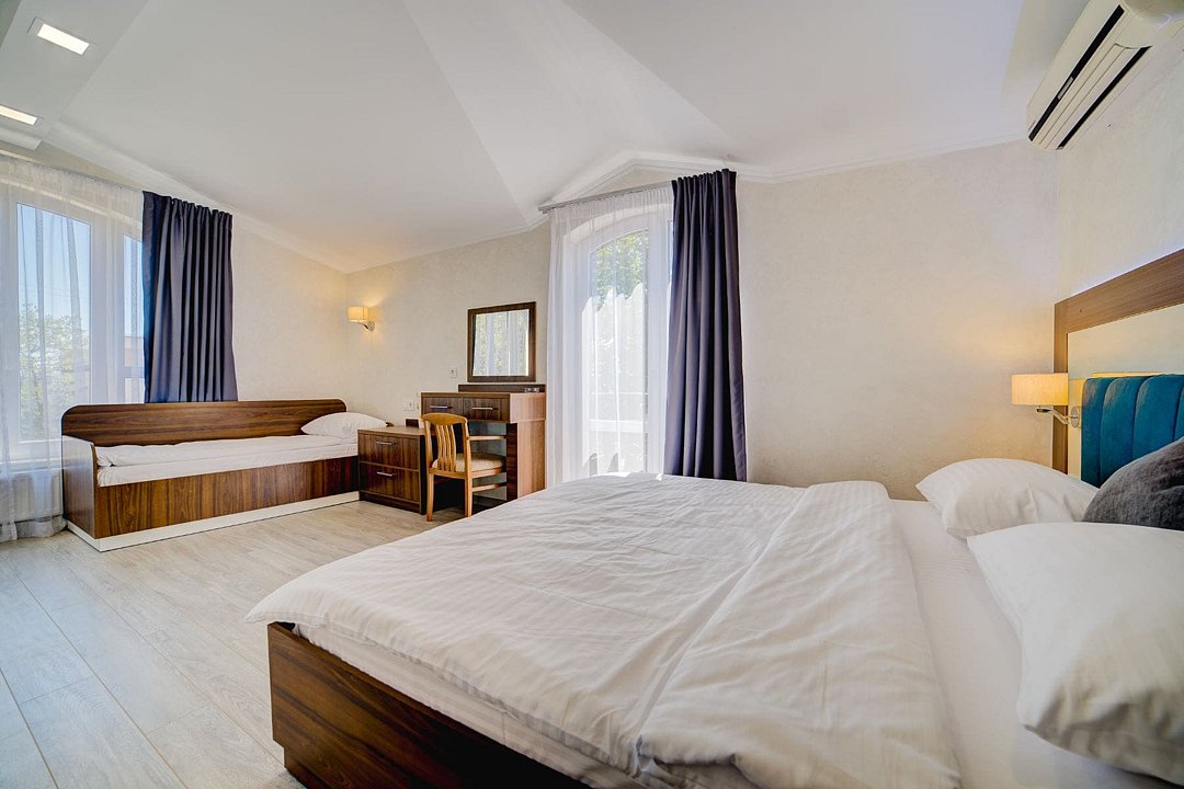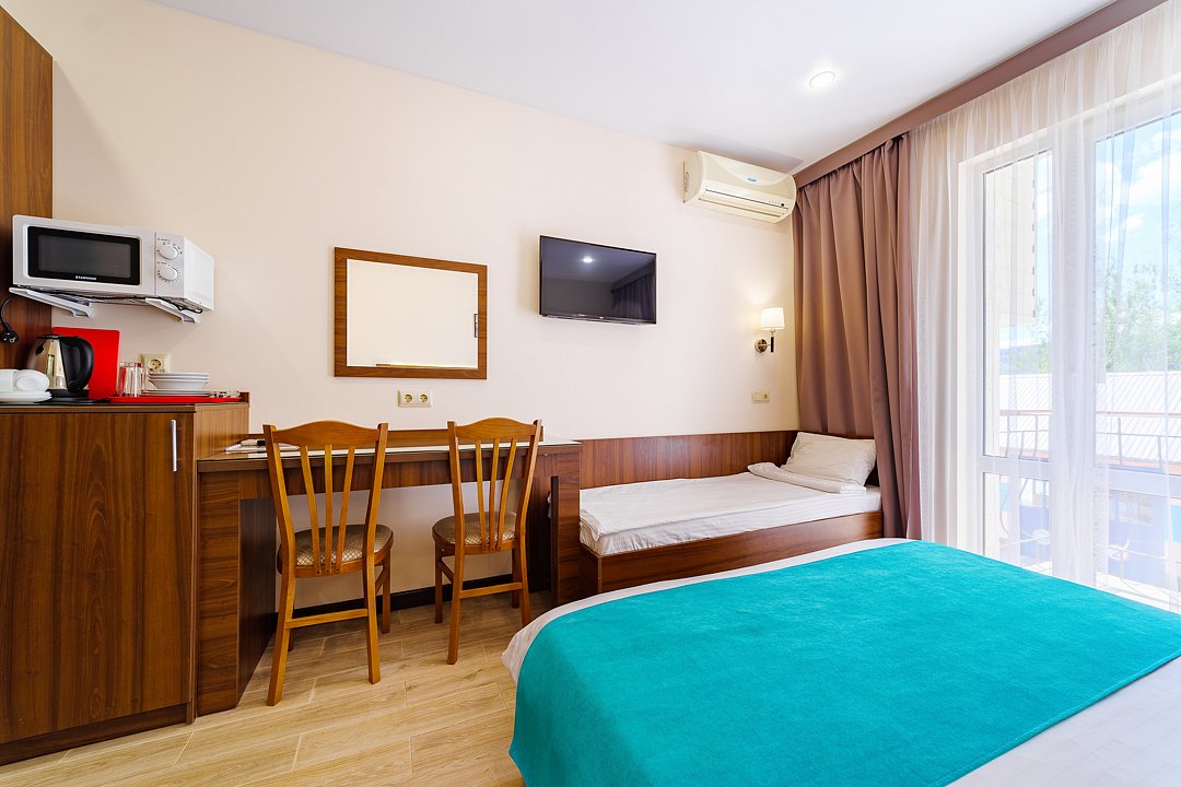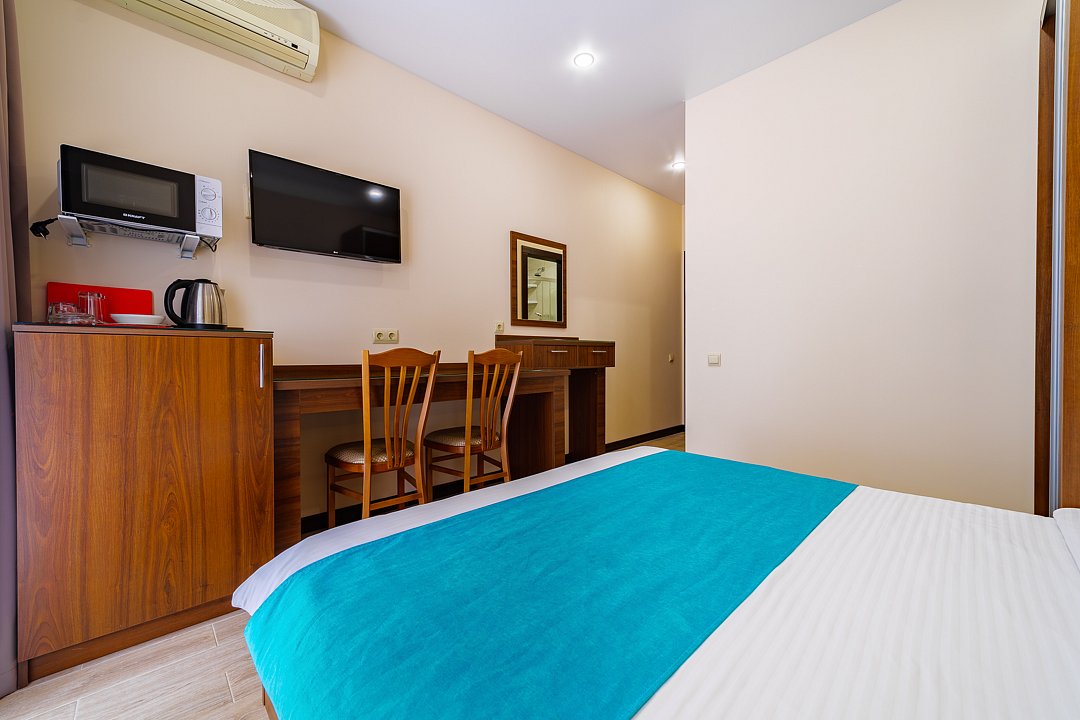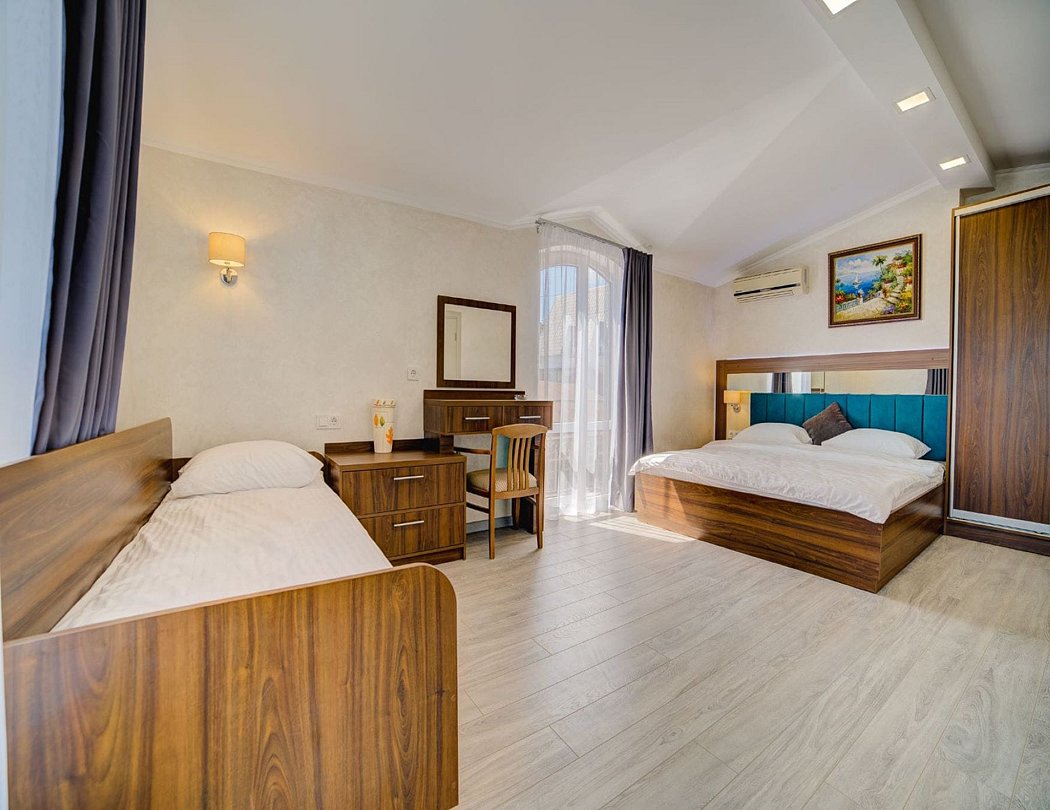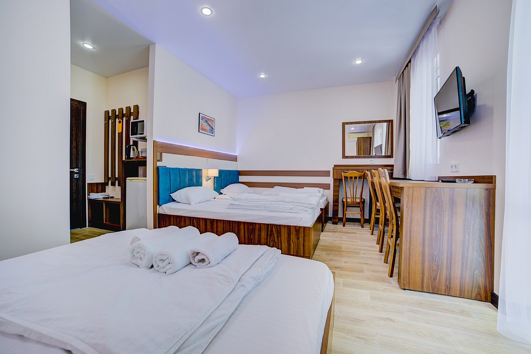 К вашим услугам: двуспальная кровать, односпальная кровать с ортопедическими матрасами, кондиционер, телевизор, холодильник, микроволновая печь, чайник, набор посуды, сейф, тапочки. С/у с душевой кабинкой, фен, гигиенические наборы, мыло, гель, шампунь.
