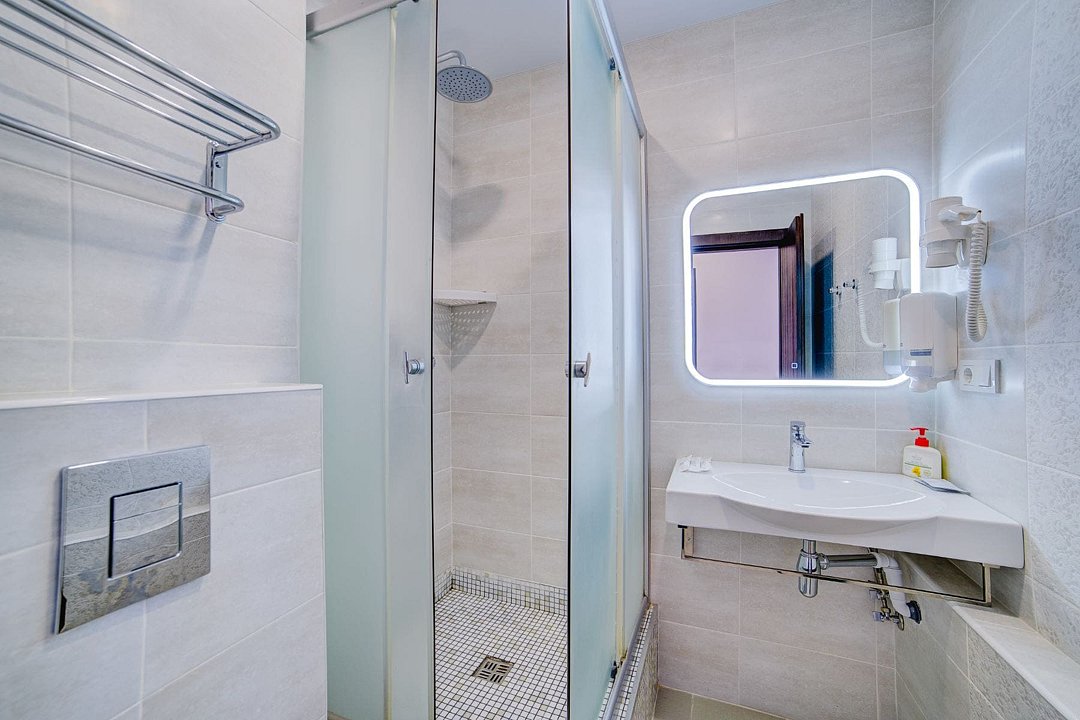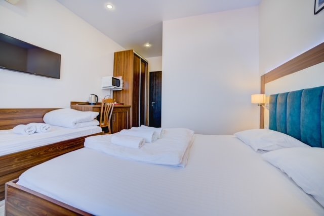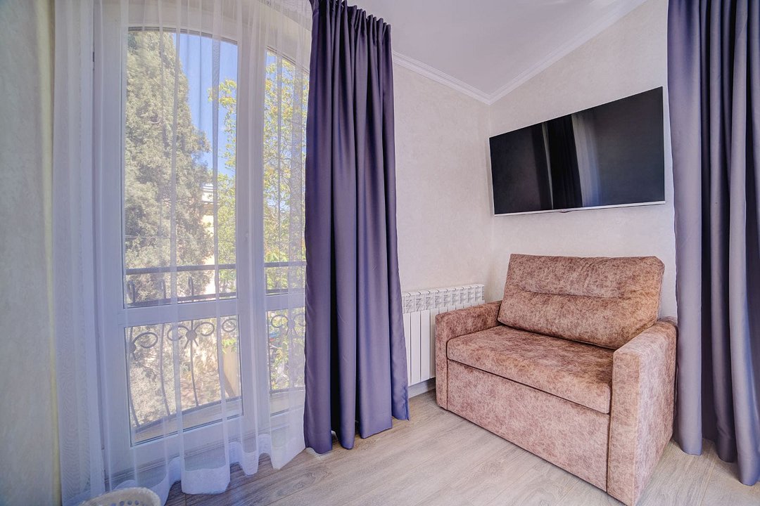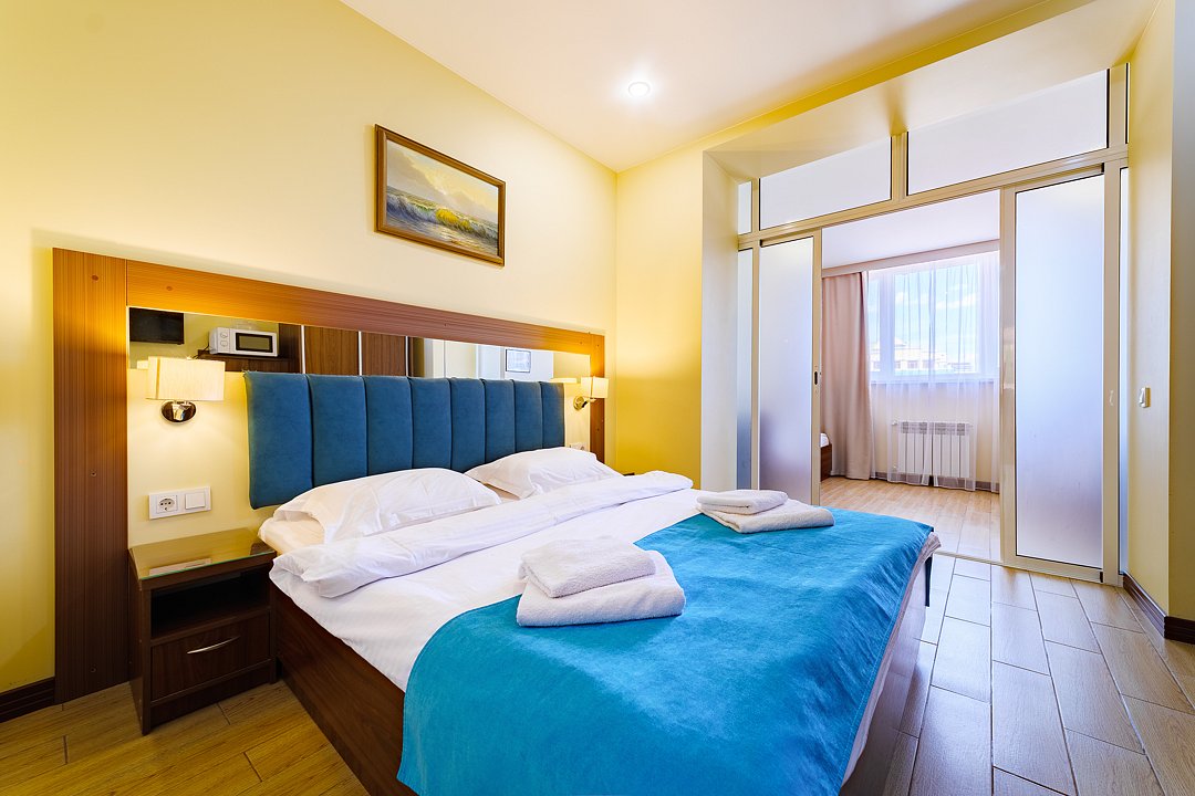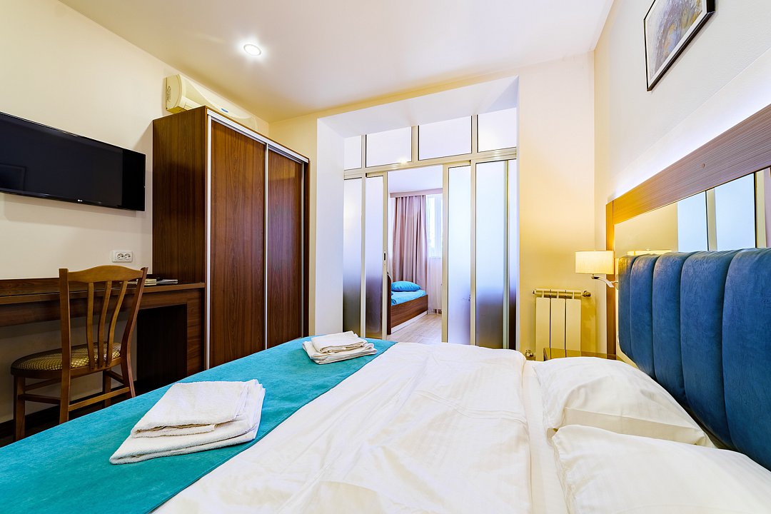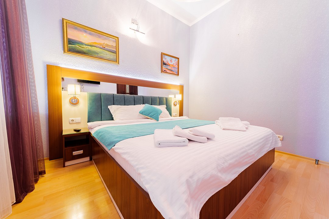 К вашим услугам: двуспальная кровать, односпальная кровать с ортопедическими матрасами, кондиционер, телевизор, холодильник, микроволновая печь, чайник, набор посуды, сейф, тапочки. С/у с душевой кабинкой, фен, гигиенические наборы, мыло, гель, шампунь.