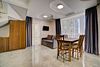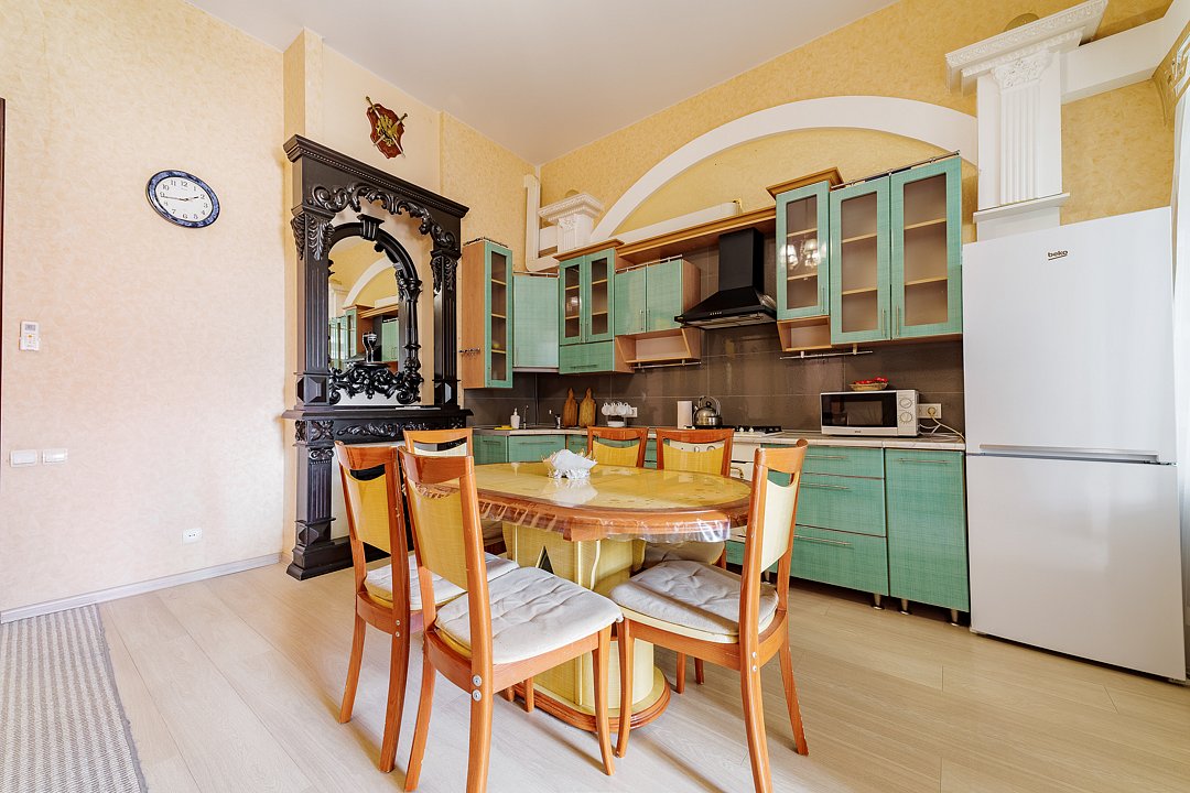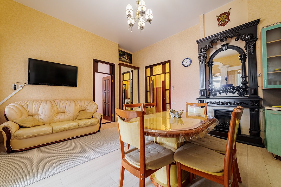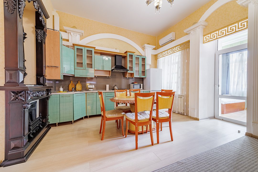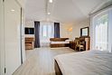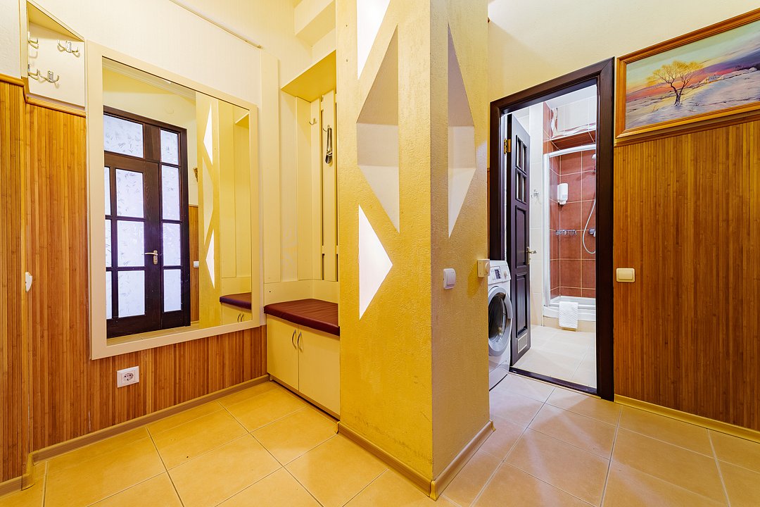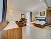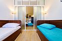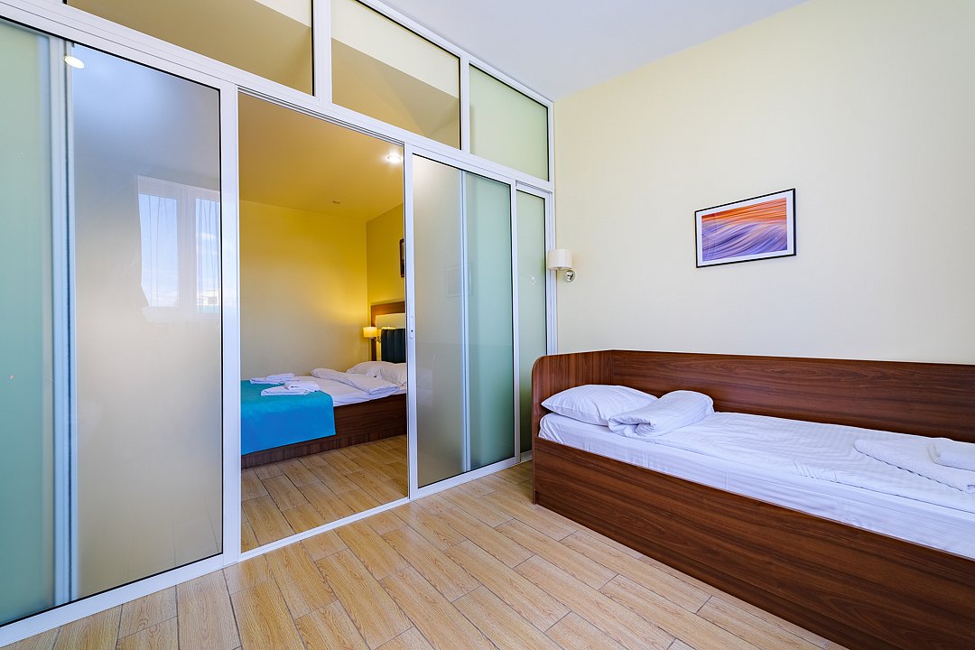 К вашим услугам: двуспальная кровать, две односпальных кровати с ортопедическими матрасами, оборудованная кухня с посудой и электрической плитой, стиральная машина, холодильник, чайник, микроволновая печь, кондиционер, сейф, телевизор, тапочки. С/у с душевой кабинкой, фен, гигиенические наборы, мыло, гель, шампунь. Предусмотрена перегородка для деления комнаты на две части.