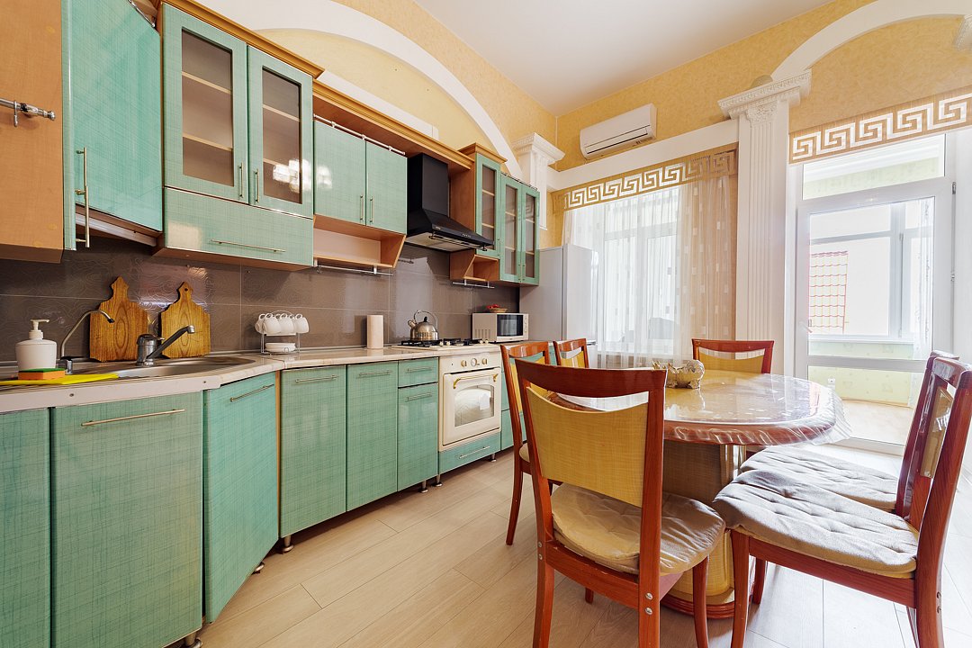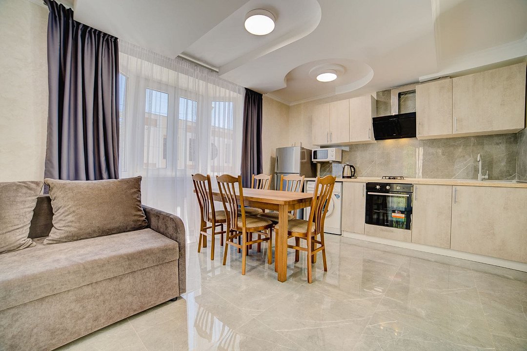 Апартаменты 4-х комнатные. 1 этаж гостевого дома. К вашим услугам: две двуспальные кровати, одна односпальная кровать с ортопедическими матрасами, раскладной двуспальный диван, три кондиционера, два телевизора, оборудованная кухня с газовой плитой, холодильник, микроволновая печь, чайник, набор посуды, стиральная машина. С/у с душевой кабинкой и ванной.