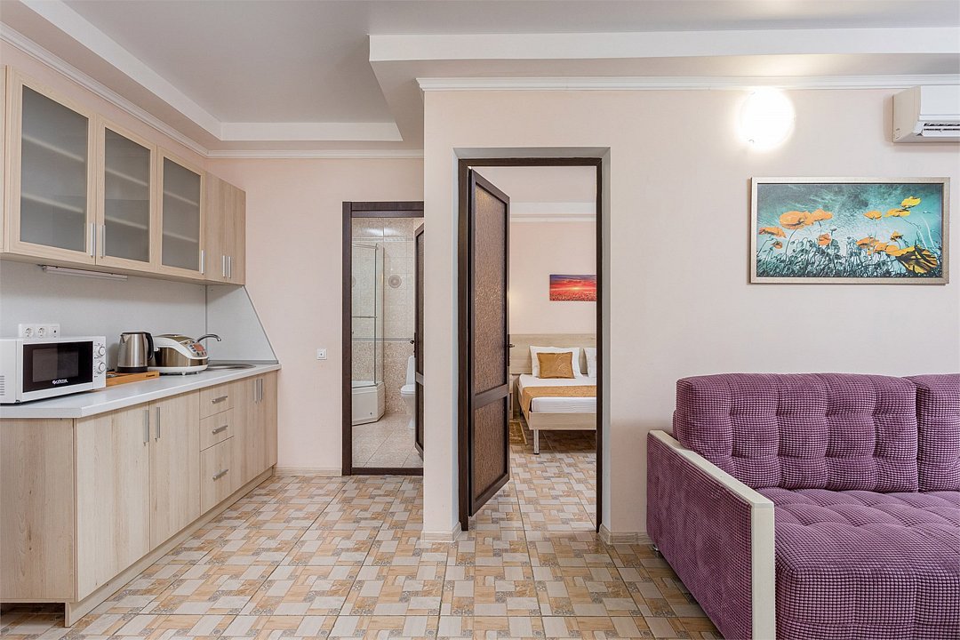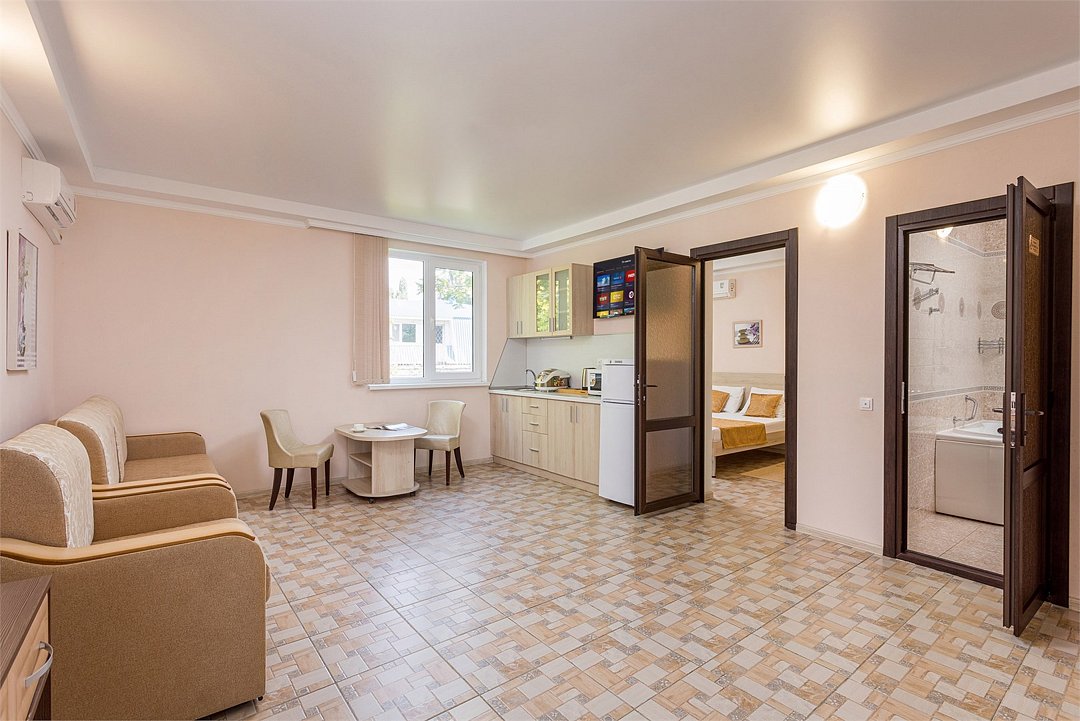 Wi-Fi, холодильник, кондиционер, фен, микроволновая печь, санузел, халаты, пляжные полотенца, тапочки, двуспальная кровать, тумбы, стулья, шкаф для одежды, зеркало, две комнаты, кухня, набор посуды, чайник, раковина, душ, вид во двор, стаканы, столовые приборы, туалетные средства, сушилка для белья, диван-кровать, раскладной диван, телевизор с плоским экраном, без питомцевВ гостиничном номере