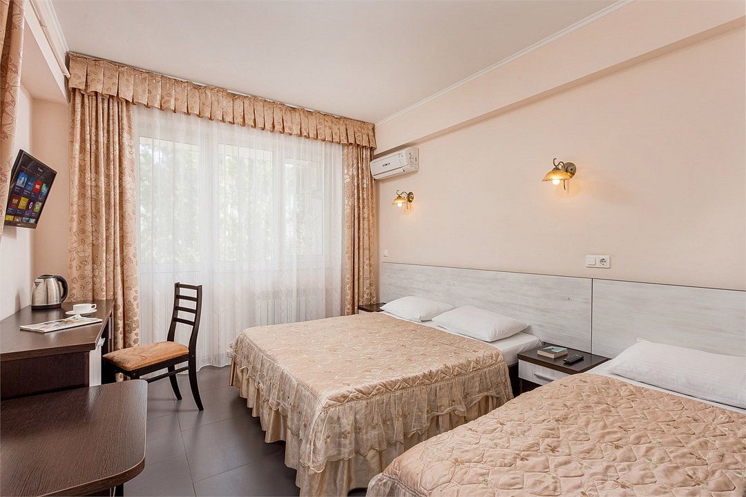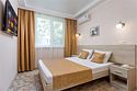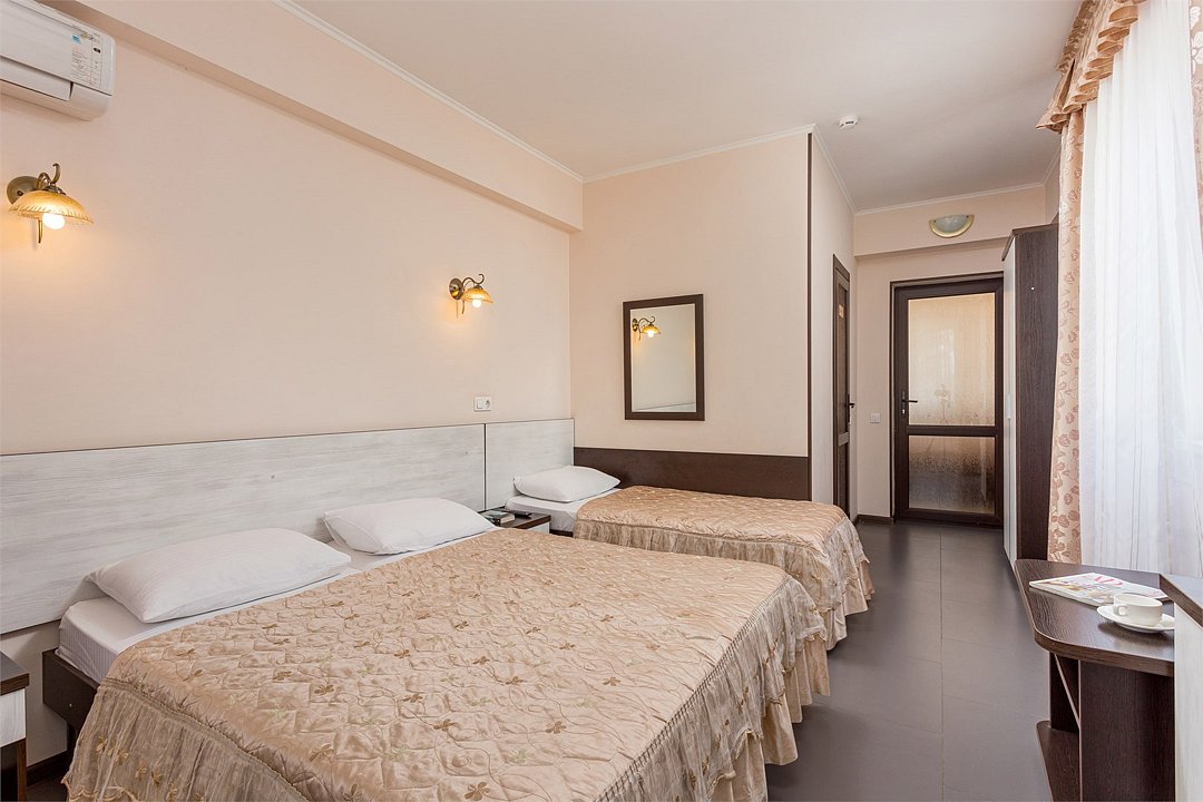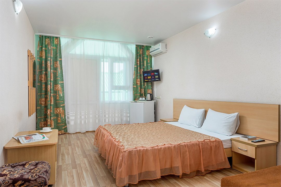 Wi-Fi, холодильник, кондиционер, санузел, пляжные полотенца, односпальная кровать, две односпальные или большая двуспальная кровать, тумбы, стулья, шкаф для одежды, журнальный столик, зеркало, чайник, раковина, душ, вид во двор, стаканы, туалетные средства, сушилка для белья, телевизор с плоским экраном, номер для некурящих, без питомцевВ гостиничном номере