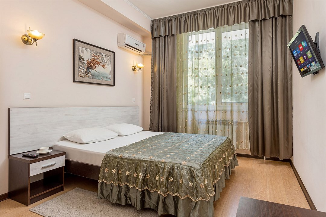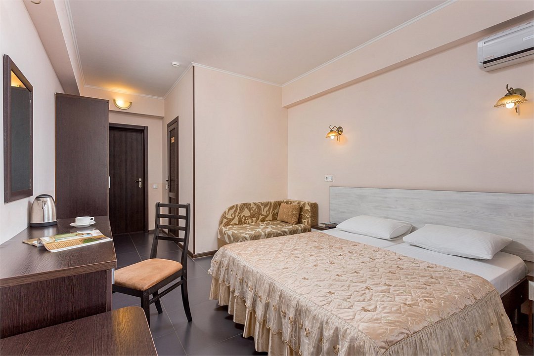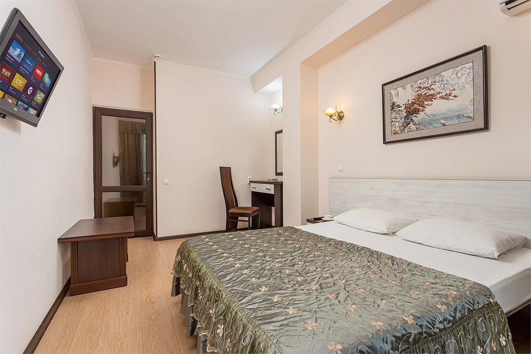 Wi-Fi, холодильник, кондиционер, санузел, халаты, пляжные полотенца, тапочки, балкон, лоджия, двуспальная кровать, тумбы, стулья, шкаф для одежды, вешалки, журнальный столик, зеркало, комод, чайный набор, чайник, душ, туалетные средства, сушилка для белья, диван-кровать, раскладной диван, телевизор с плоским экраном, без питомцевВ гостиничном номере