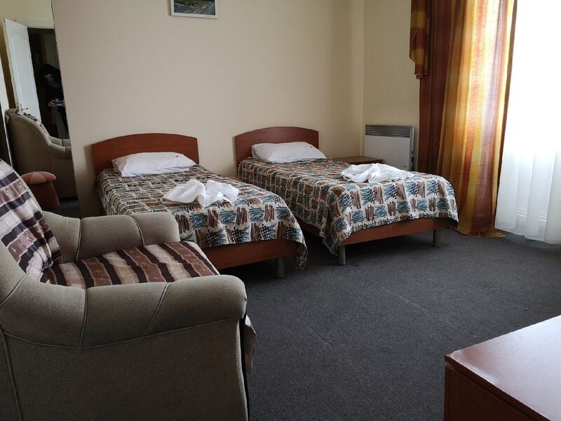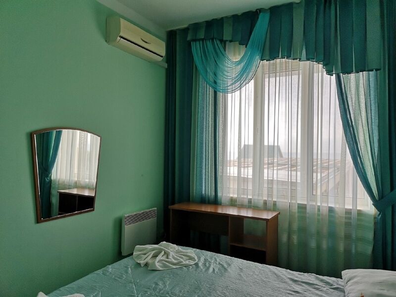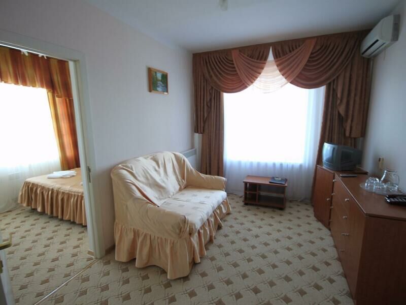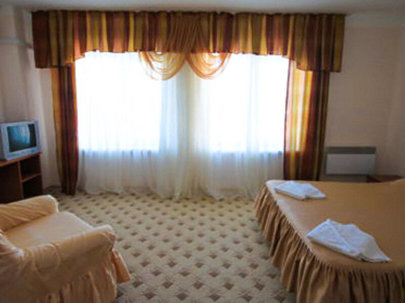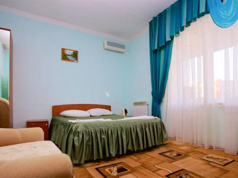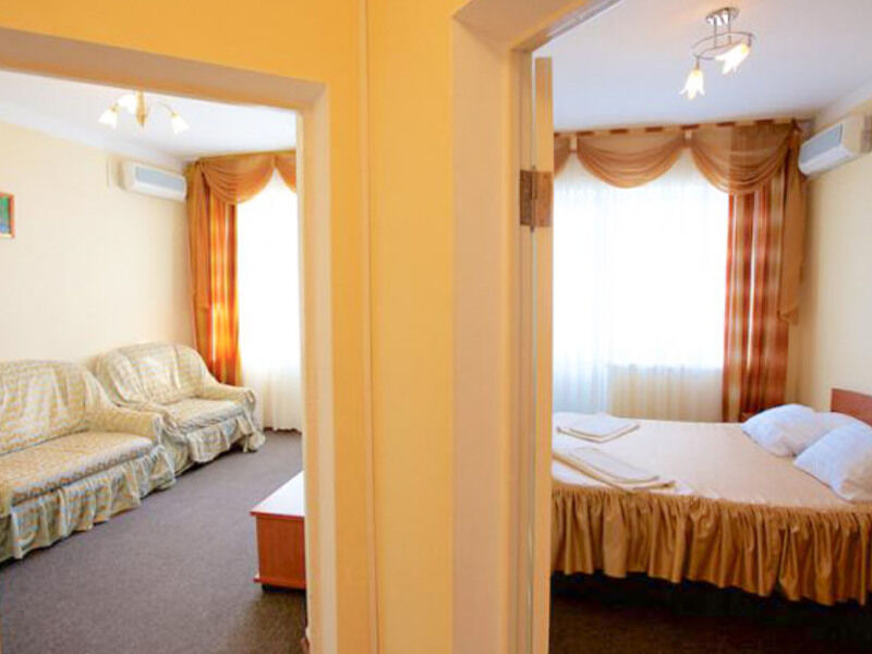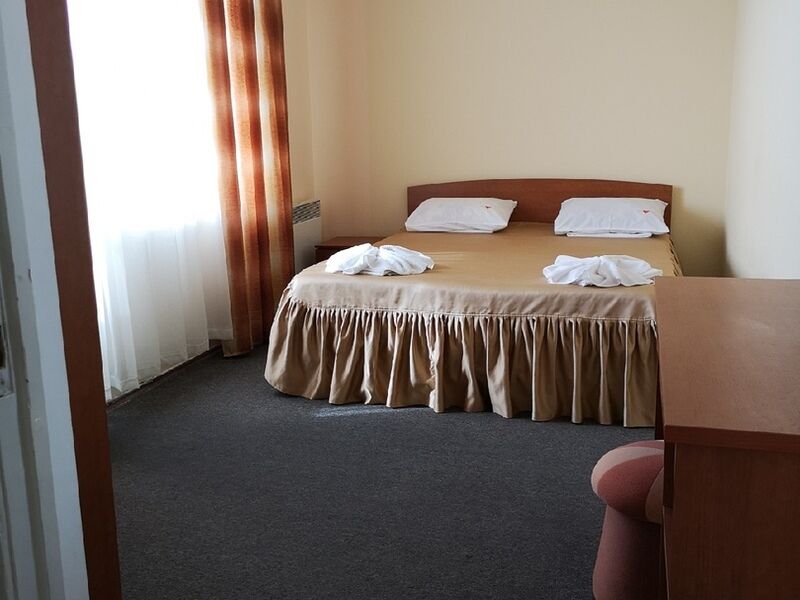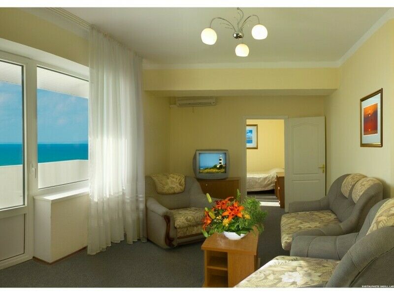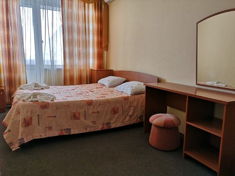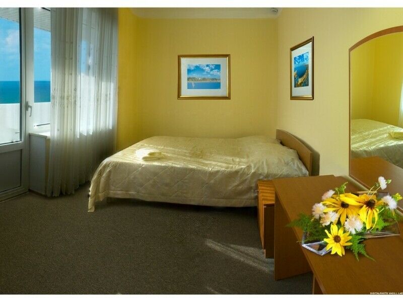 Белоснежное шестиэтажное здание отеля возвышается в тихом и спокойном районе, на благоустроенной территории площадью 16000 кв.м. Отель, рассчитанный на размещение восьмидесяти отдыхающих, предлагает своим гостям просторные двух, трех-, четырехместные номера, из окон которых открываются виды на море. В номерах имеется необходимый набор мебели, бытовой техники, установлена сплит-система и санузел с ванной.