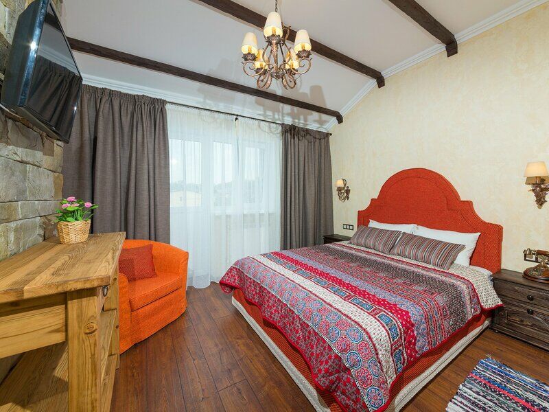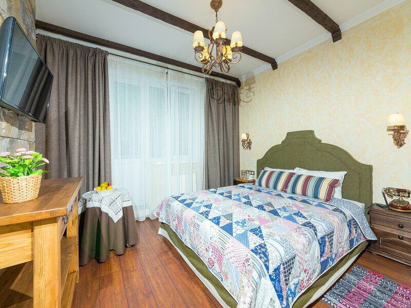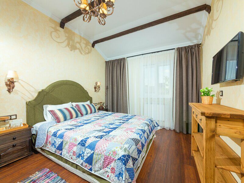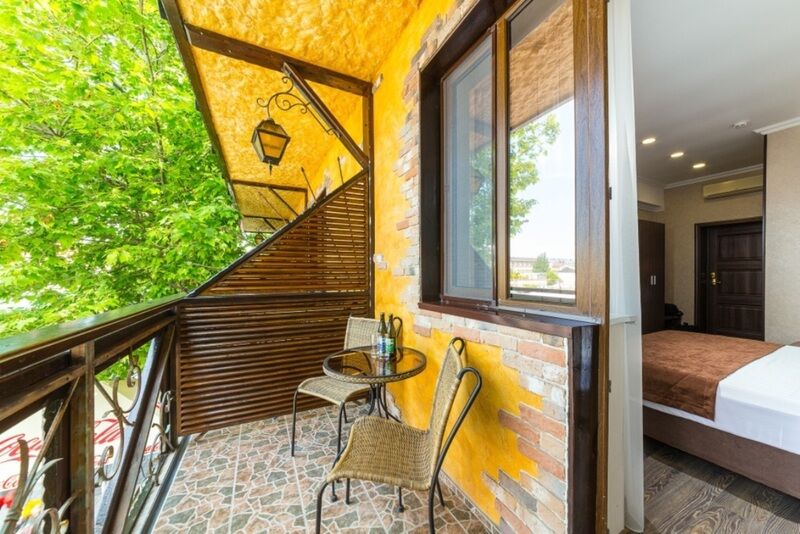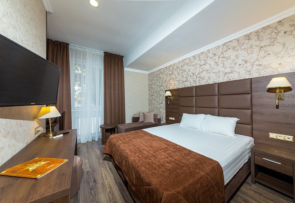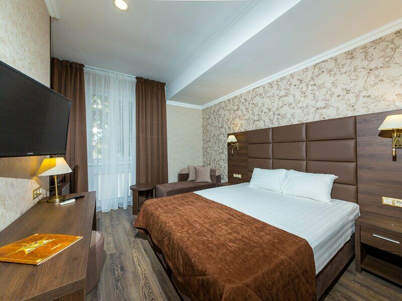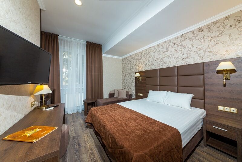 Четырехэтажное здание отеля оформлено в стиле, напоминающем исторический стиль Франции XVII века. Просторные номера категорий Стандарт и Люкс с удобной мягкой мебелью и качественной английской сантехникой способны вместить до сорока гостей. В них есть все, что потребуется для комфортного отдыха: современная техника – кондиционер, холодильник, электрочайник, минимальный набор посуды, собственная ванная комната с косметическими принадлежностями.