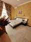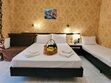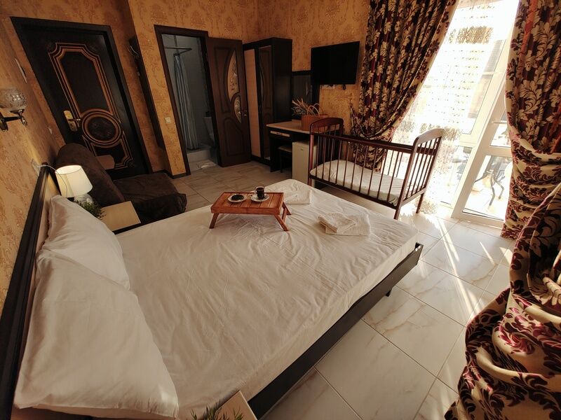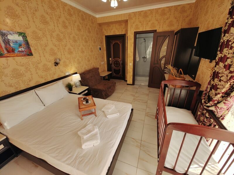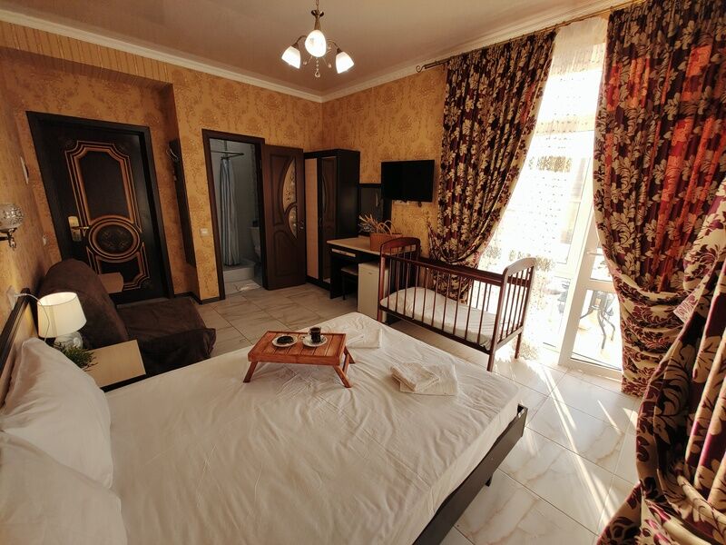 Двуспальная кровать и односпальная кровать или кресло-кровать, прикроватные тумбочки, шкаф, туалетный столик, журнальный столик, вешалка, зеркало, пуфик, мини-холодильник, ТВ, кондиционер. Ванная комната — душевая и санузел, фен, набор полотенец.
