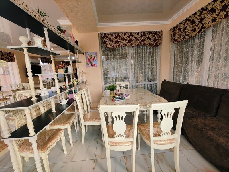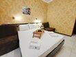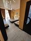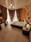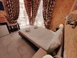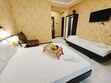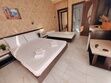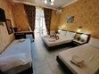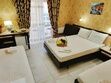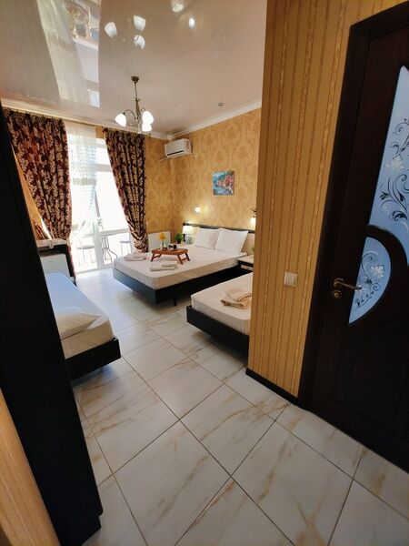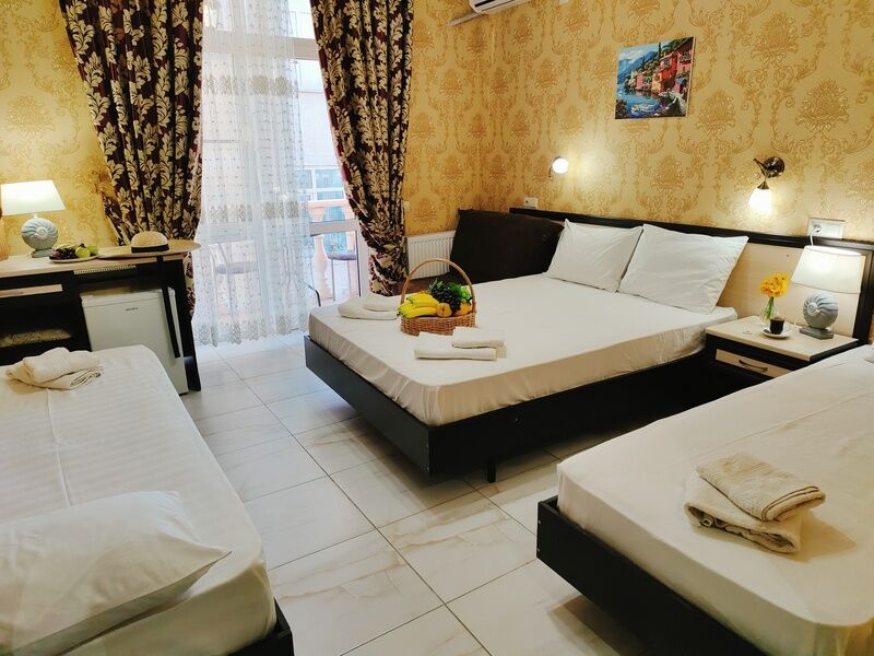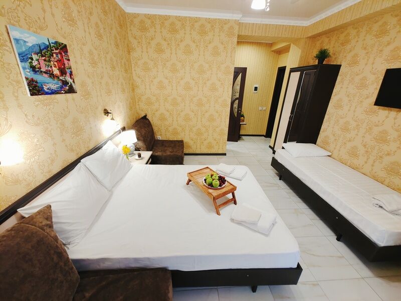 Двуспальная кровать, две односпальных кровати, мини-диван, прикроватные тумбочки, шкаф, туалетный столик, журнальный столик, вешалка, зеркало, холодильник, ТВ, кондиционер, пуфик. Ванная комната — душевая и санузел, фен, набор полотенец.