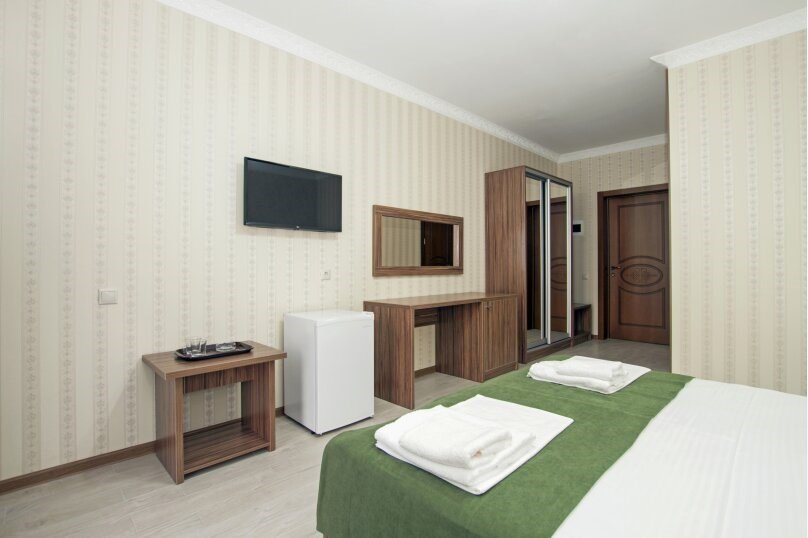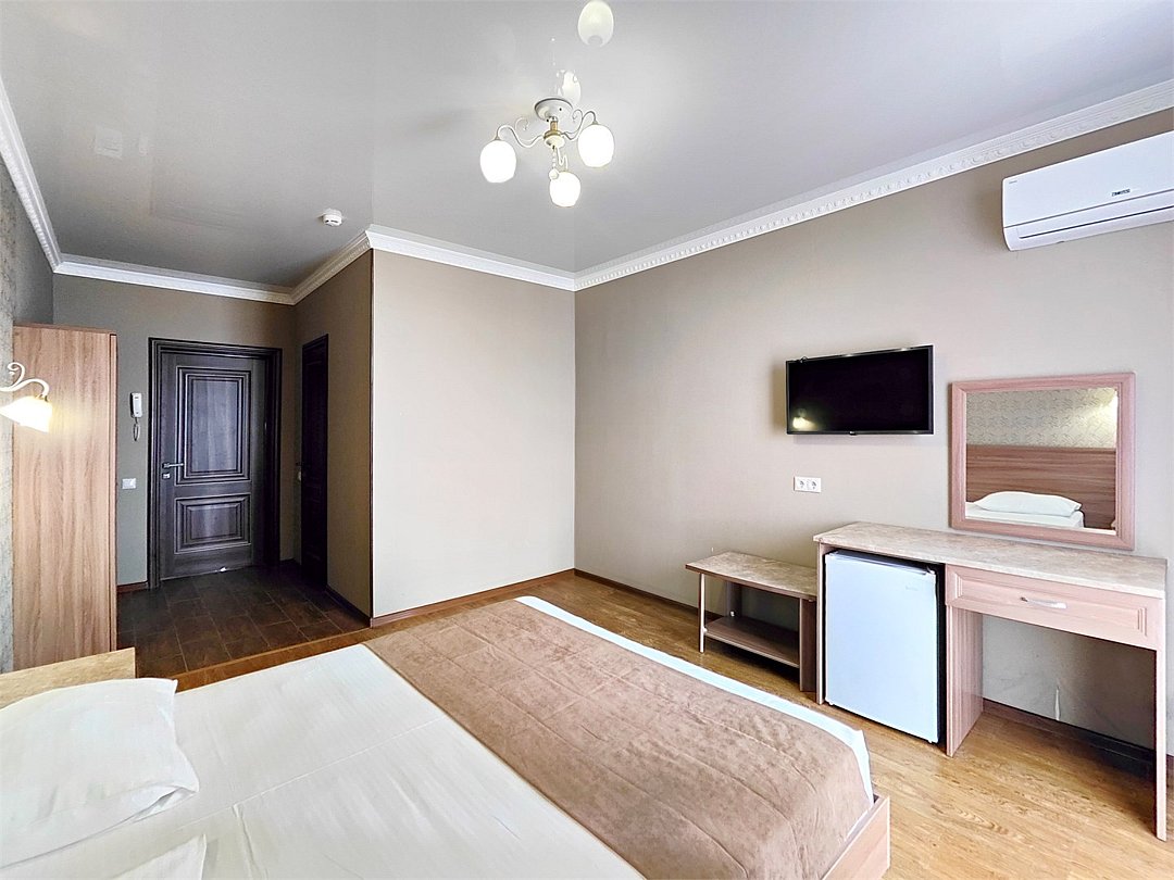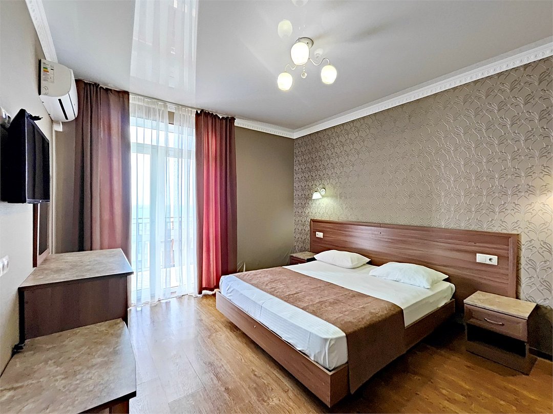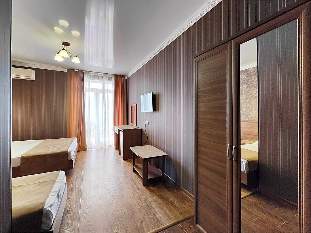 телевизор, Wi-Fi, светильник, фен, утюг, санузел, банные полотенца, пляжные полотенца, балкон, две двуспальные кровати, две односпальные или большая двуспальная кровать, шкаф для одежды, журнальный столик, зеркало, мебельный гарнитур, обслуживание номеров, сейф, унитаз, раковина, косметическое зеркало, душ, вид на море, кулер на этаже, стаканы, туалетный столик, туалетный столик, туалетные средства, сплит-система, москитная сетка, шкаф-купе, гостиничная парфюмерия, вешалки-плечики, мыло, можно с питомцами, уличная мебель, душ у бассейнаВ гостиничном номере