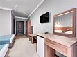Мебель: двуспальная кровать, две кровати односпальных, 2 тумбочки, туалетный столик, журнальный столик, шкаф платяной, вешалка в прихожей. Удобства: Кондиционер, холодильник, телевизор, сейф, балкон со столом и стульями, комплект гостевых принадлежностей (индивидуальный комплект банных и лицевых полотенец, мыло жидкое, таз, бельевые веревки на балконе, туалетная бум., стаканы). Напольное покрытие плитка.Услуги и удобства