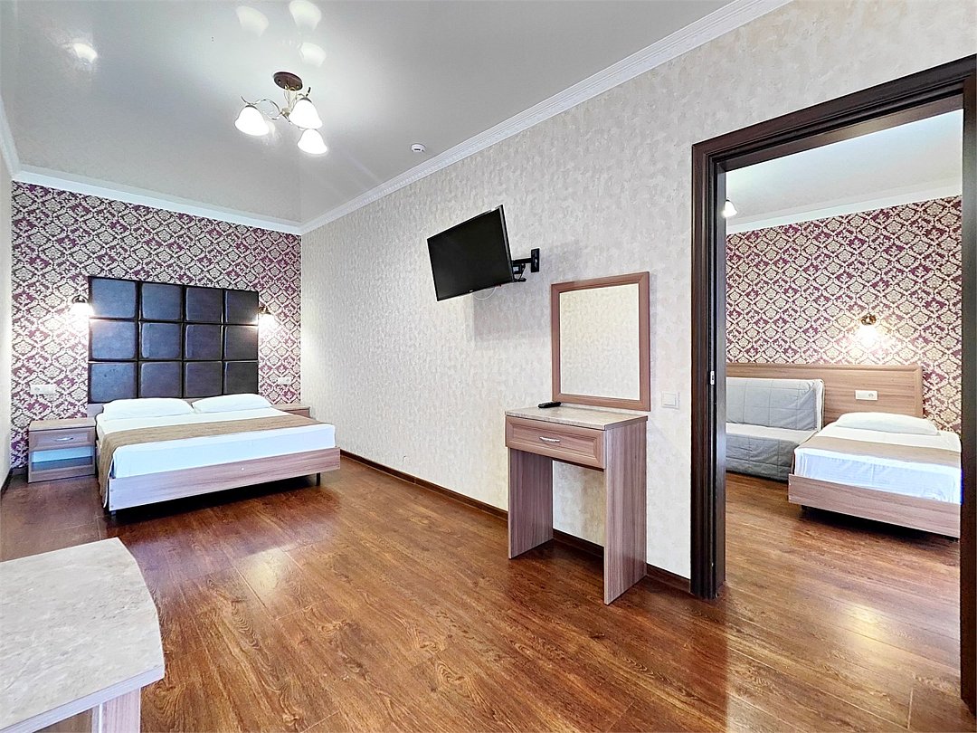 два телевизора, Wi-Fi, светильник, фен, ванна или душевая кабина, санузел, банные полотенца, пляжные полотенца, балкон, двуспальная кровать, две односпальные кровати, стулья, шкаф для одежды, вешалки, журнальный столик, мебельный гарнитур, две комнаты, сейф, унитаз, раковина, душ, вид на море, вид на город, кулер на этаже, туалетный столик, тумба, туалетный столик, сплит-система, внутренний телефон, мини-холодильник, москитная сетка, шкаф-купе, гостиничная парфюмерия, вид на бассейн, кресло-кровать, межкомнатная дверь, уборка номера, вешалки-плечики, мыло, затемняющая штора, можно с питомцами, тропический душ, уличная мебельВ гостиничном номере