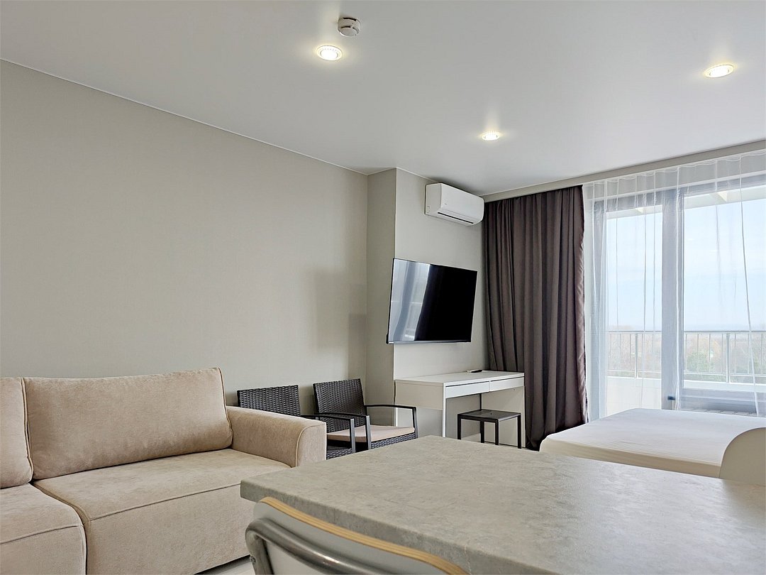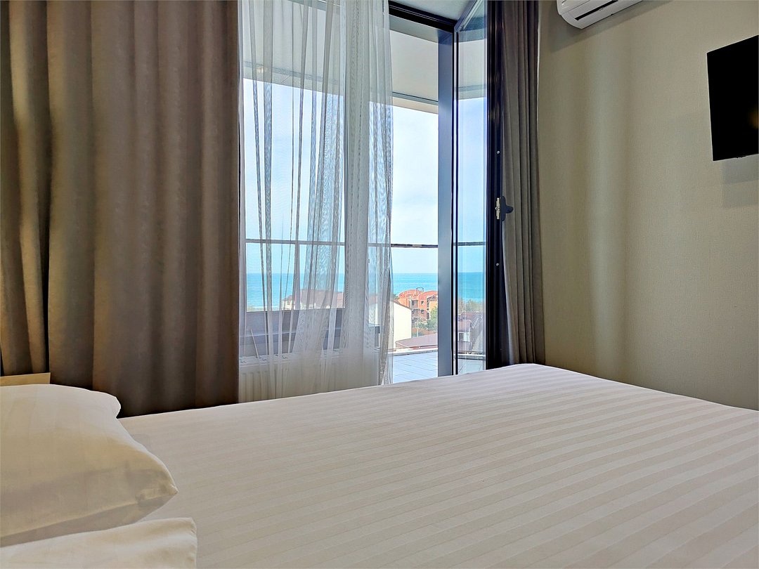 два телевизора, Wi-Fi, светильник, фен, ванна или душевая кабина, банные полотенца, пляжные полотенца, две односпальные или большая двуспальная кровать, шкаф для одежды, журнальный столик, ковер, мебельный гарнитур, две комнаты, сейф, чайник, унитаз, душ, вид на море, туалетный столик, стул, туалетный столик, сплит-система, внутренний телефон, мини-холодильник, шкаф-купе, гостиничная парфюмерия, балкон с боковым видом на море, кресло-кровать, уборка номера, услуги прачечной (платно), мыло, можно с питомцами, уличная мебельВ гостиничном номере