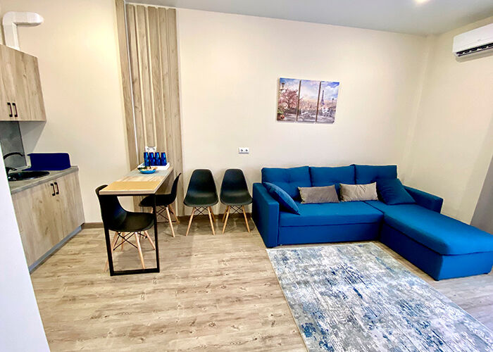 Кровать, диван-кровать кондиционер, кухня, телевизор, холодильник.
