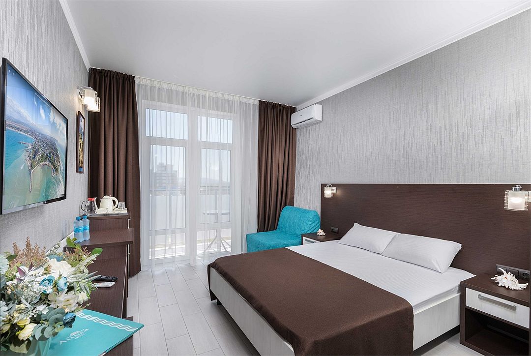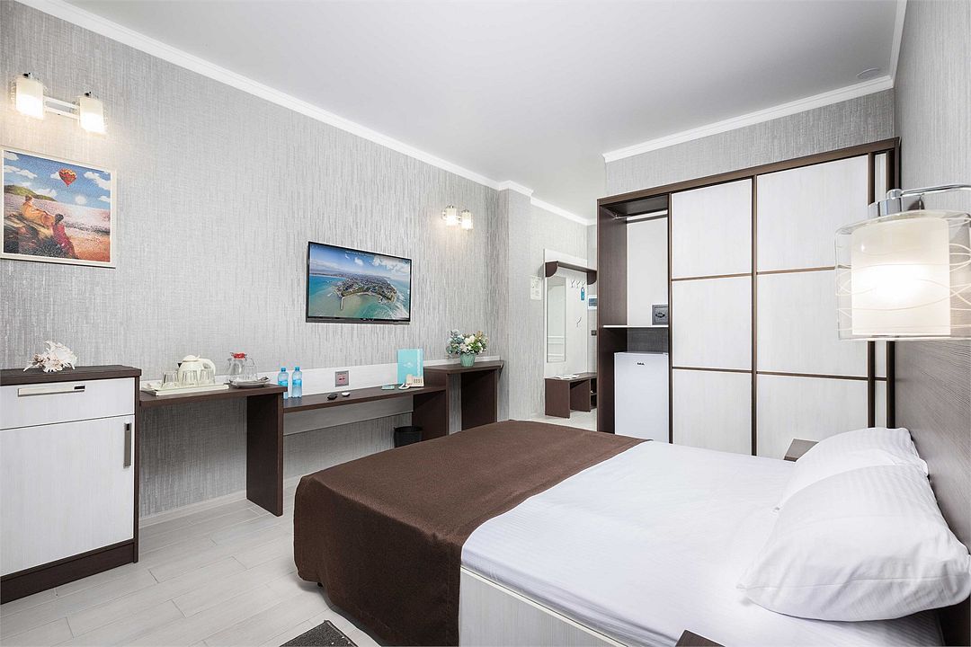 Двухэтажный корпус отеля разместился на первой береговой линии. Небольшой номерной фонд, рассчитанный на 62 человека, предлагает гостям номера категории Комфорт и Люкс. В номерах стильный лаконичный интерьер, выдержанный в светлых тонах с добавлением шоколадных оттенков. Все комнаты оснащены кондиционером, душем, есть телевизор, фен, холодильник.