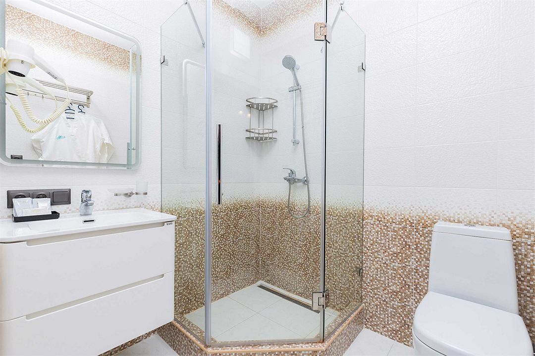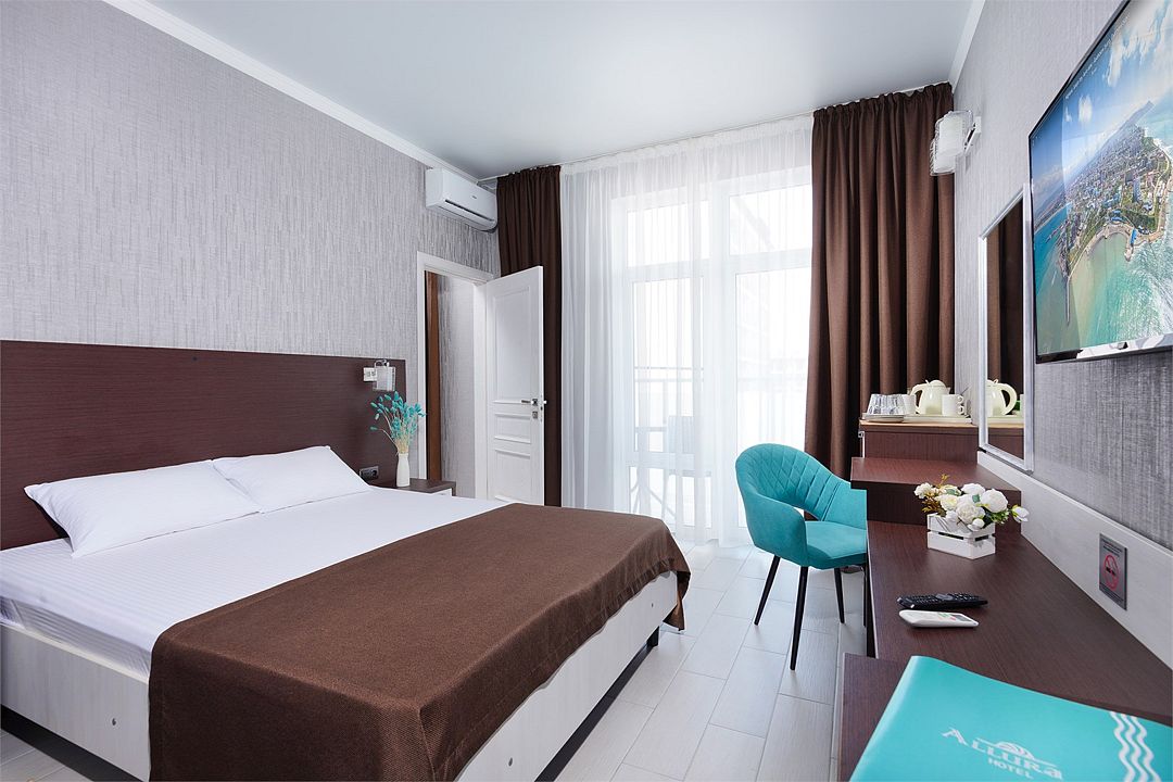 телевизор, Wi-Fi, телефон, холодильник, душевая кабина, банные полотенца, гигиенические средства, косметические средства, балкон, две односпальные или большая двуспальная кровать, гардеробная, зеркало, сейф, унитаз, раковина, тумба, сплит-система, раскладное кресло, шкаф-купе, можно с питомцамиВ гостиничном номере