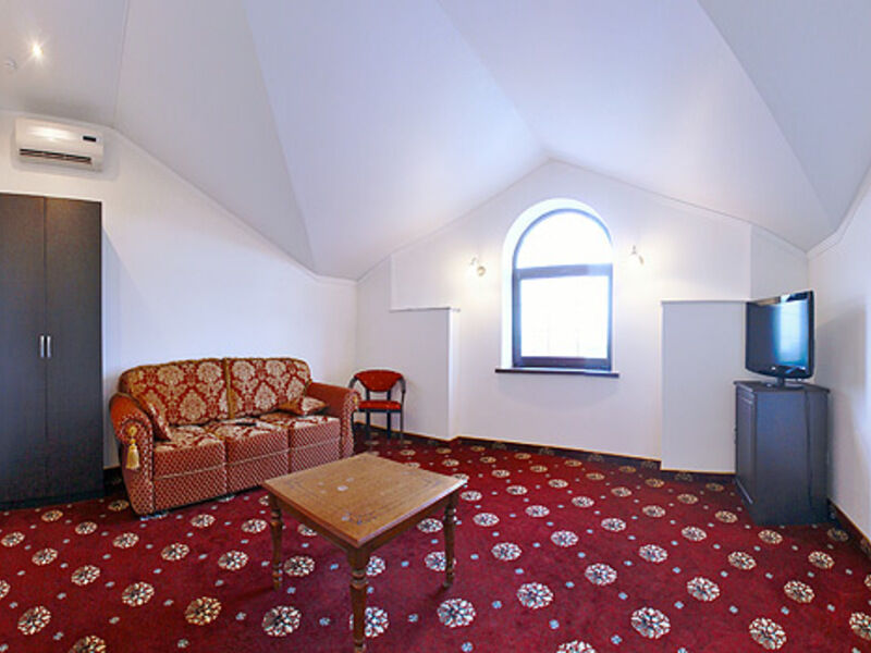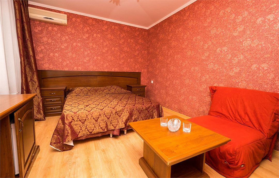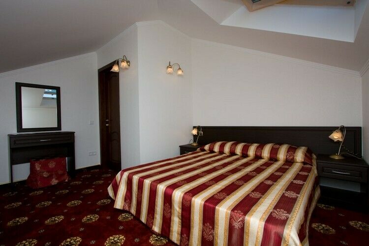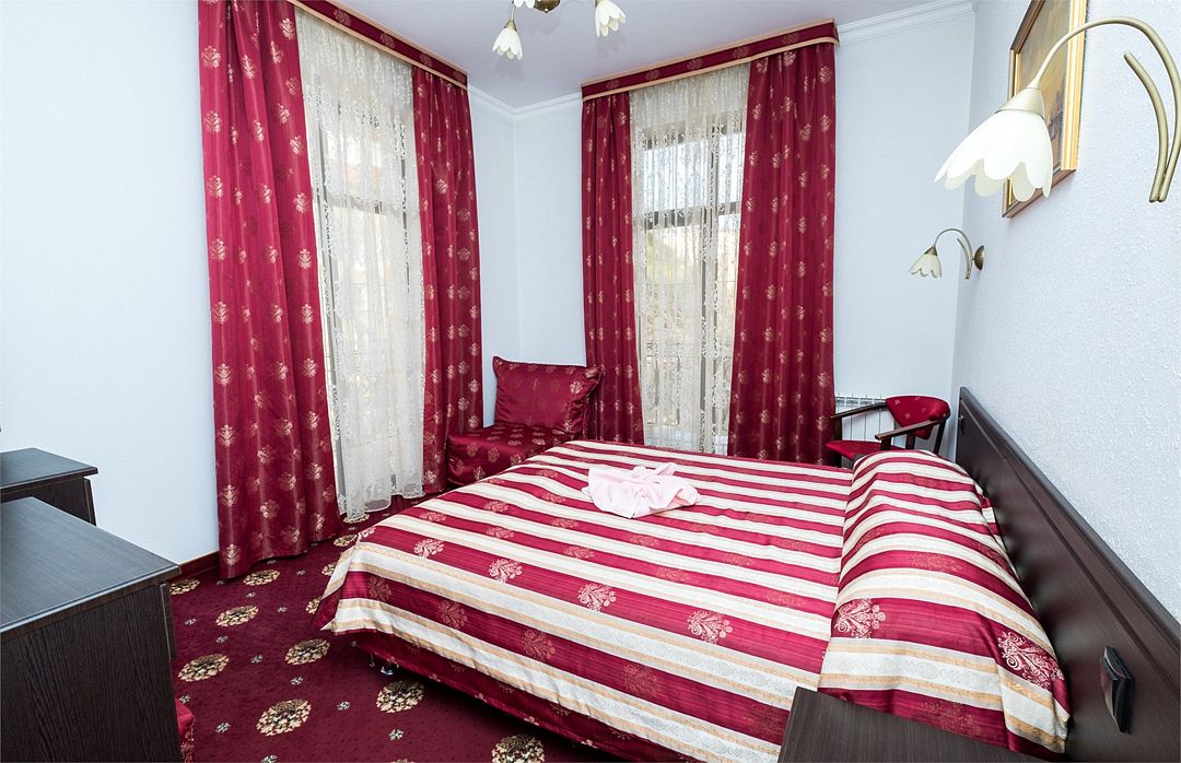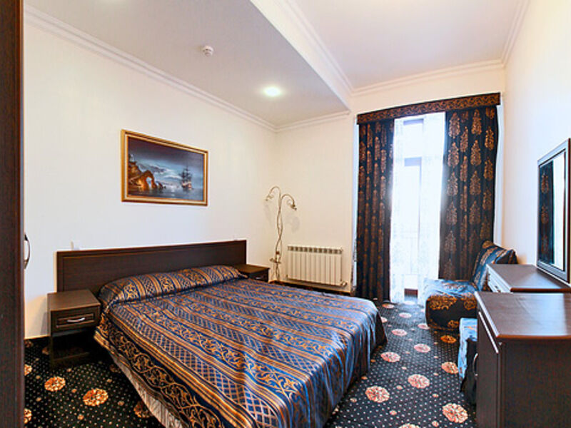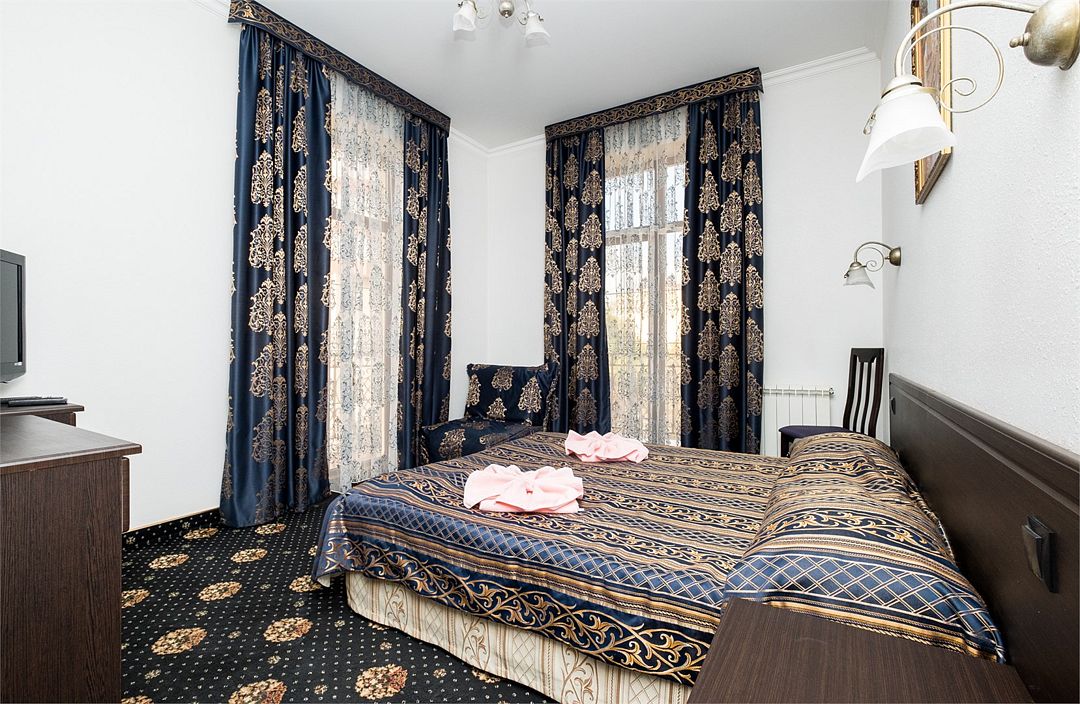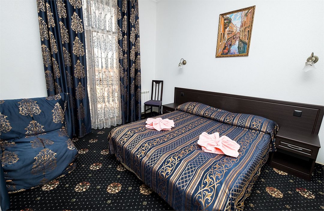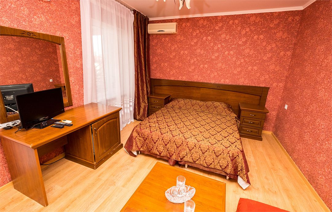 В номере: двуспальная кровать, прикроватные тумбочки, диван, шкаф, стол, туалетный столик, стулья, зеркало. Оборудование: сплит-система, телевизор ЖК, мини-холодильник, телефон, чайный набор посуды, wi-fi. Санузел: с душевой кабиной либо с ванной, туалетные принадлежности, халат, тапочки. Дополнительное место: возможность предоставления двух дополнительных мест.Услуги и удобства