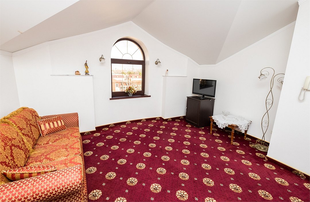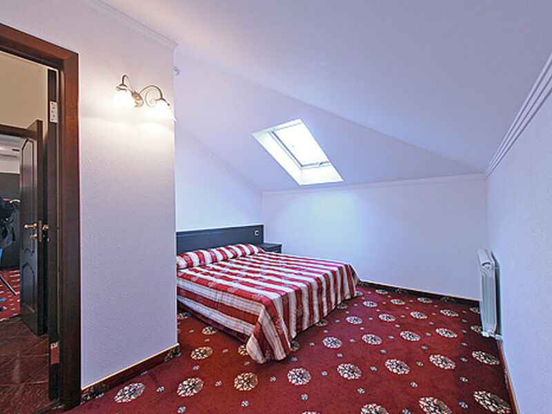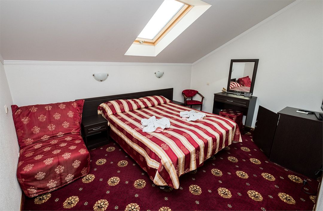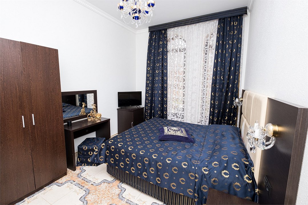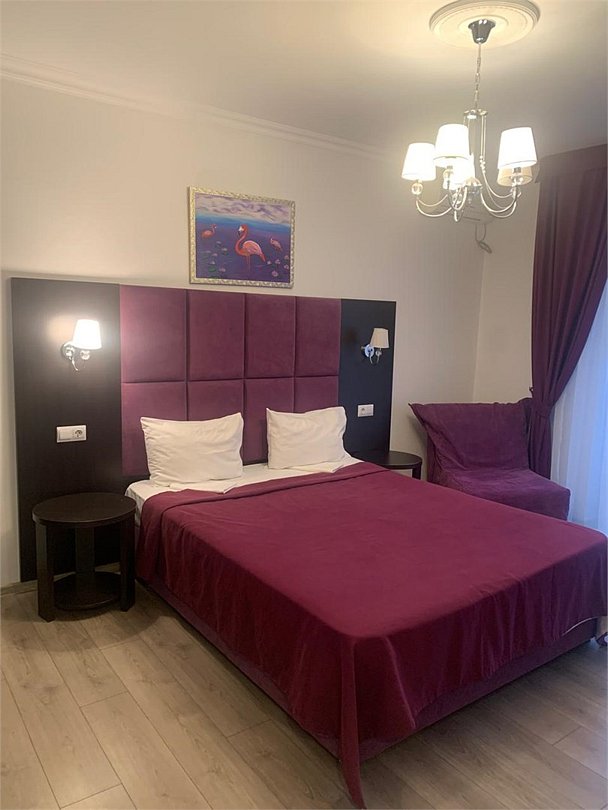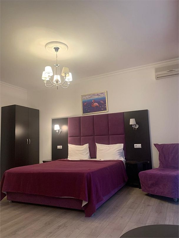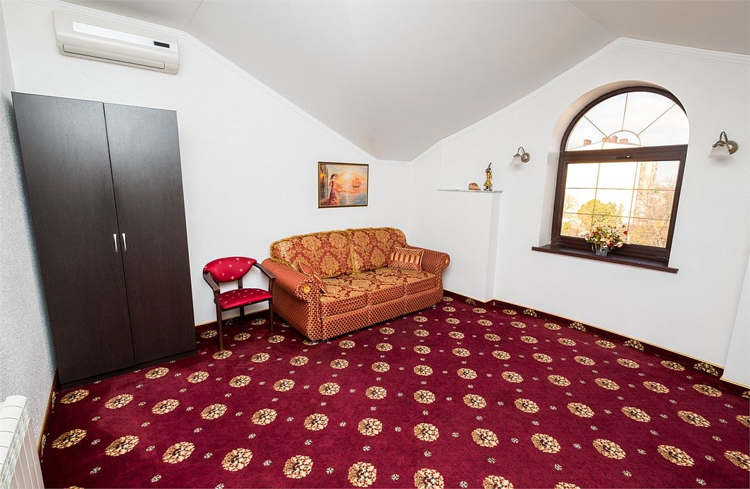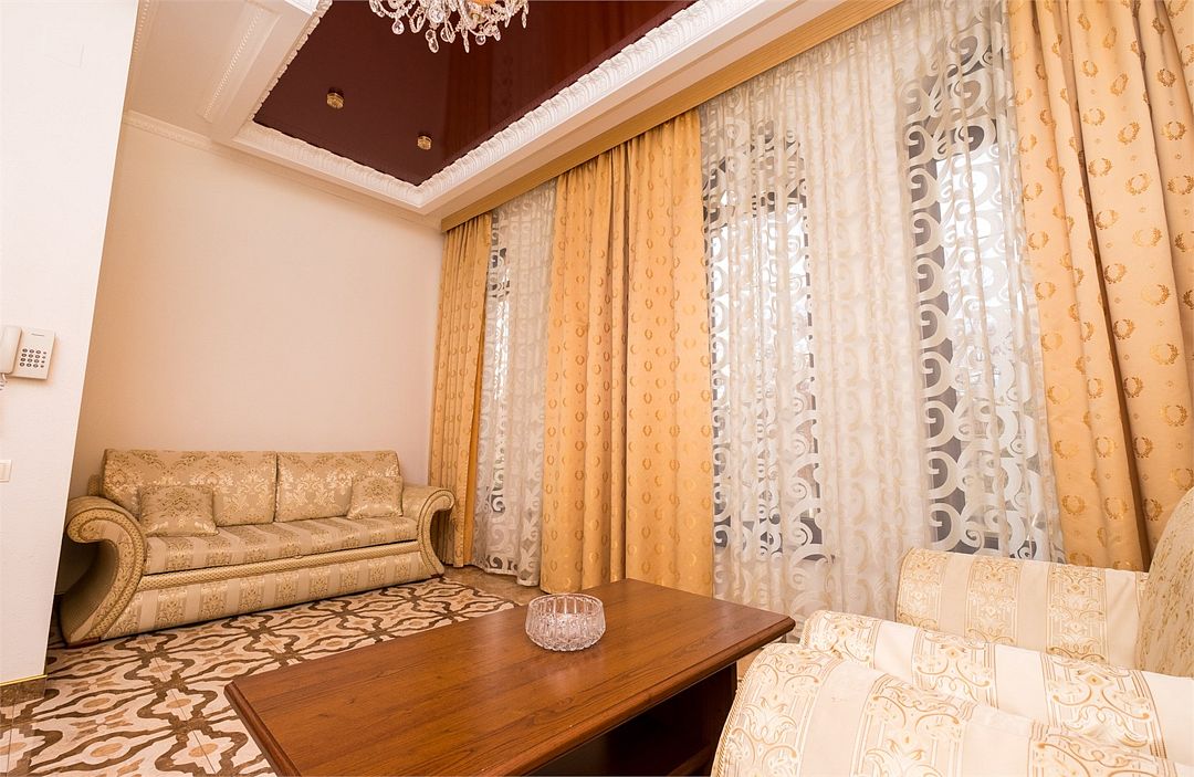В номере: двуспальная кровать, прикроватные тумбочки, диван, шкаф, стол, туалетный столик, стулья, зеркало. Оборудование: сплит-система, телевизор ЖК, мини-холодильник, телефон, чайный набор посуды, wi-fi. Санузел: с душевой кабиной либо с ванной, туалетные принадлежности, халат, тапочки. Дополнительное место: возможность предоставления двух дополнительных мест.Услуги и удобства