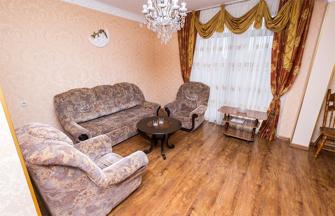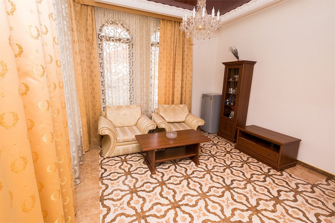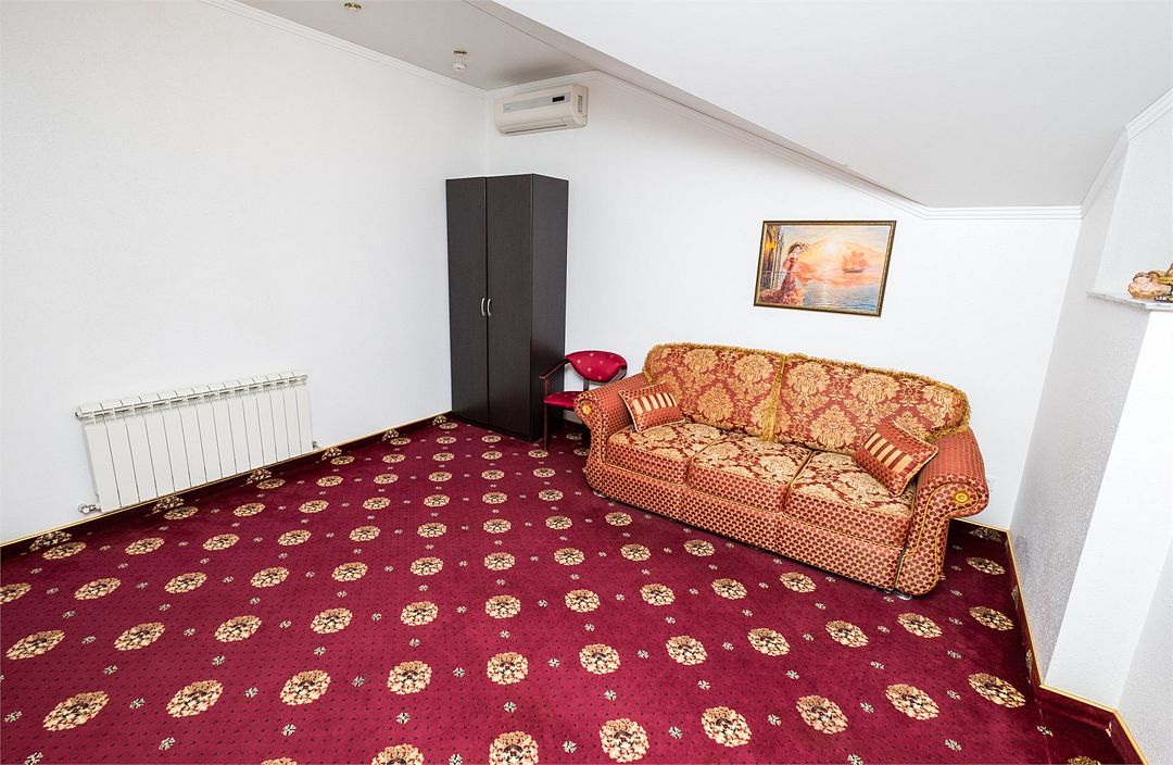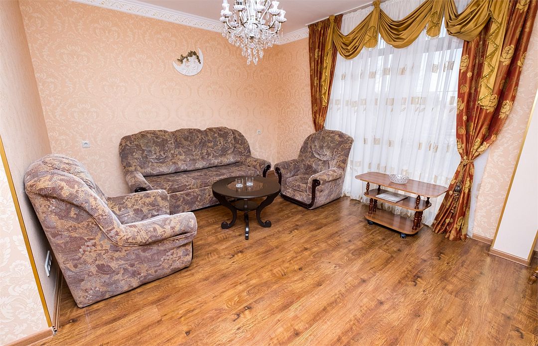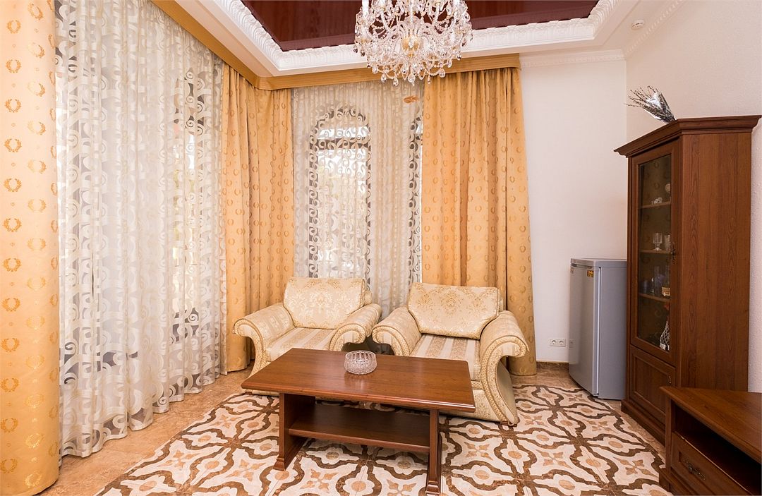 В номере: двуспальная кровать, полутороспальная кровать 2, прикроватные тумбочки, диван, кресла 2, шкаф, стол, журнальный столик, тумба под телевизор 2, туалетный столик, стулья, вешалка, пуфик, зеркало. Оборудование: сплит-система, телевизор, телевизор ЖК, холодильник, телефон, набор посуды, wi-fi. Санузел: с ванной, туалетные принадлежности, халат, тапочки. Дополнительное место: возможность предоставления одного дополнительного места.Услуги и удобства