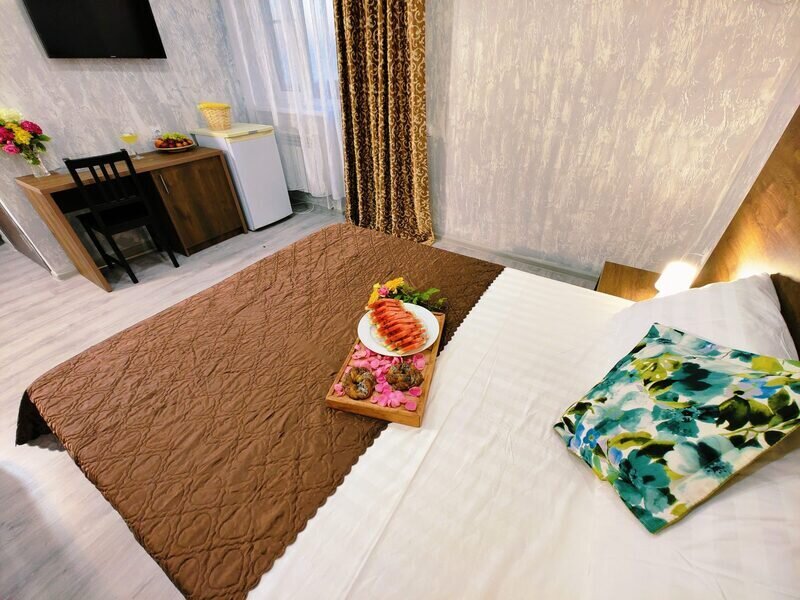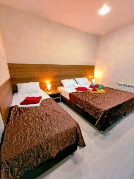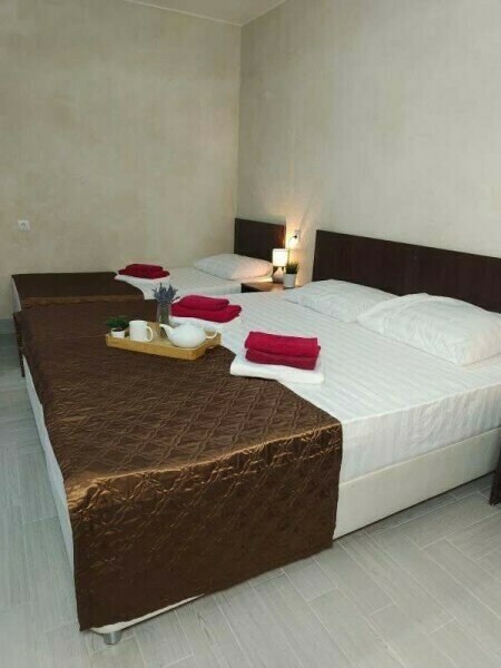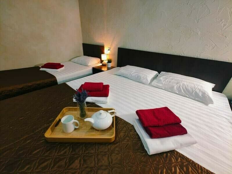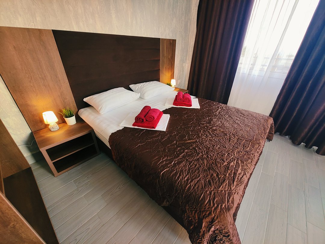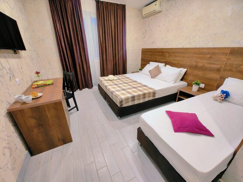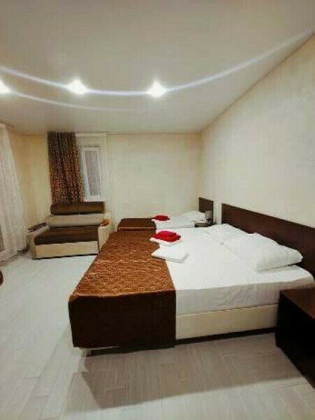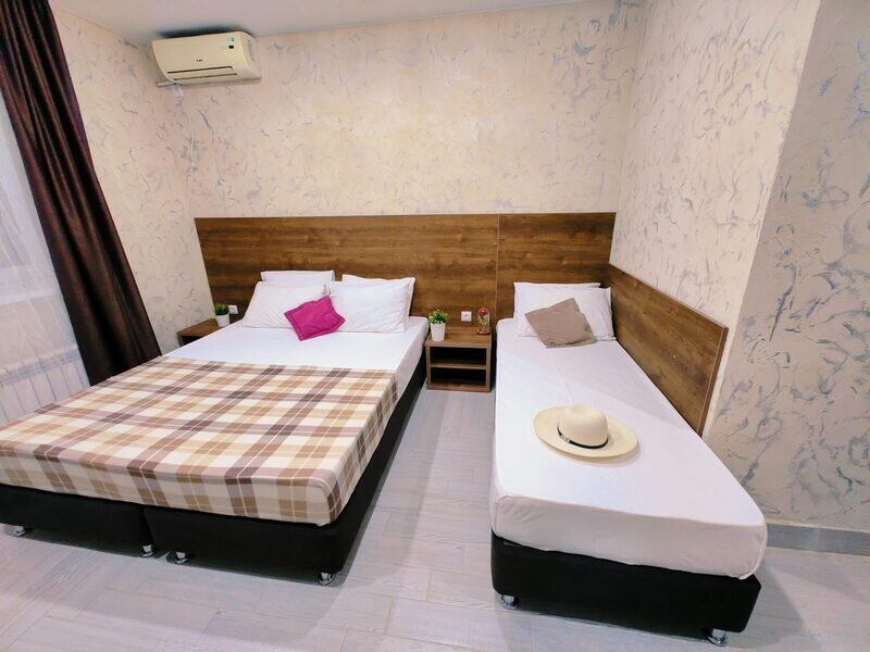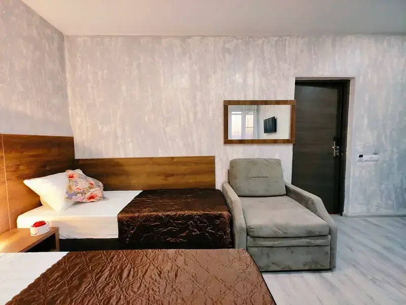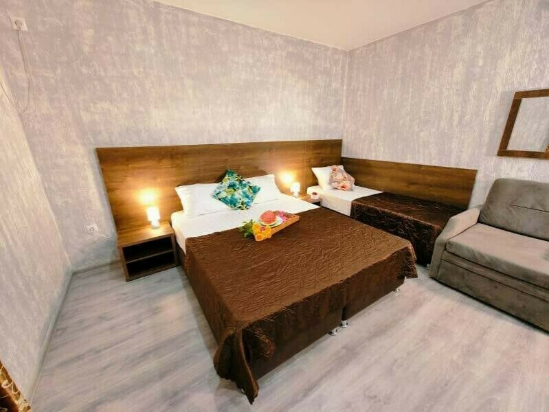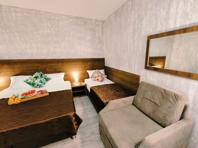 В двухкомнатном номере имеется: Две двуспальные кровати и односпальный диван, шкаф для хранения вещей и вся необходимая мебель. Для вашего удобства имеется мини-холодильник, стол, телевизор. Для доступа в интернет предусмотрен Wi-Fi. Просторный балкон станет отличным местом для отдыха на свежем воздухе. В этом номере вы сможете насладиться комфортом и уютом нашего отеля. Собственная ванная комната в номере.