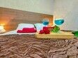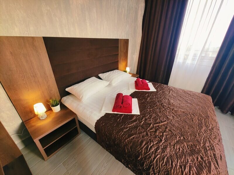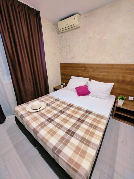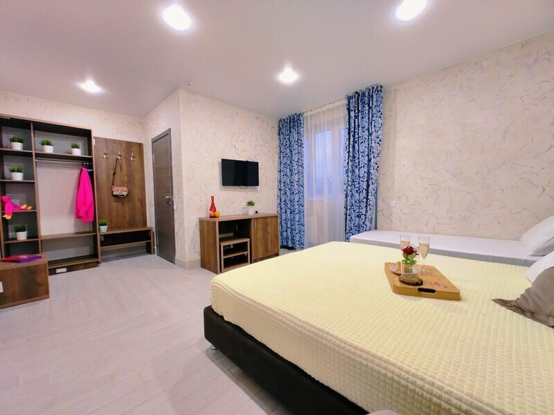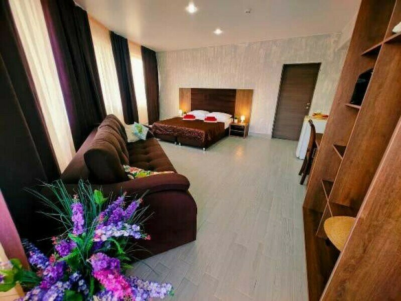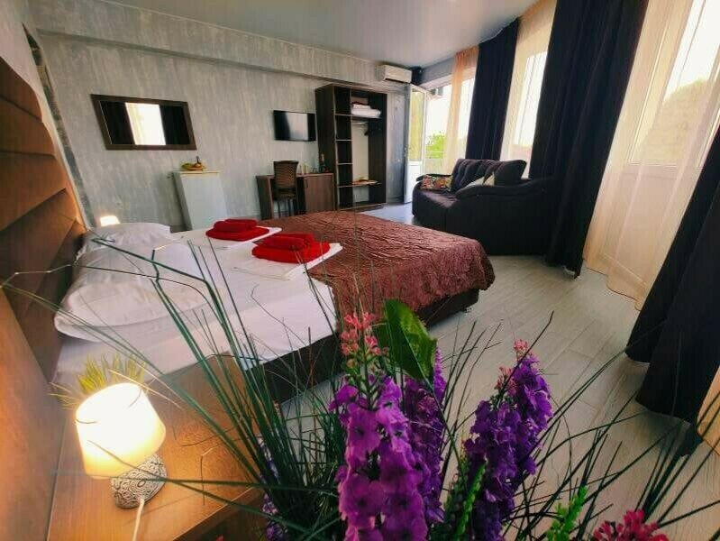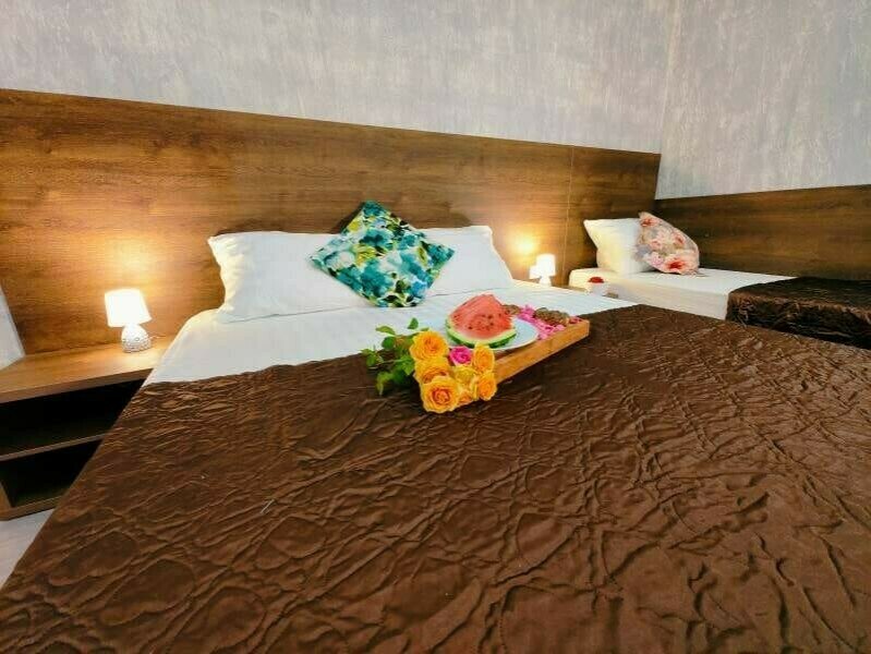 Комфортабельный и уютный двухкомнатный Люкс оснащен: двумя двуспальными кроватями и двуспальным диваном, кондиционером, шкафом для одежды и всей необходимой мебелью. Также в номере есть мини-холодильник, телевизор и Wi-Fi. Имеется просторный балкон для отдыха на свежем воздухе. Проведите незабываемое время в нашем отеле и наслаждайтесь комфортом.