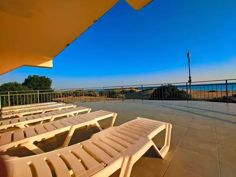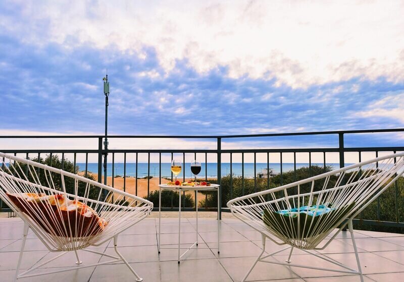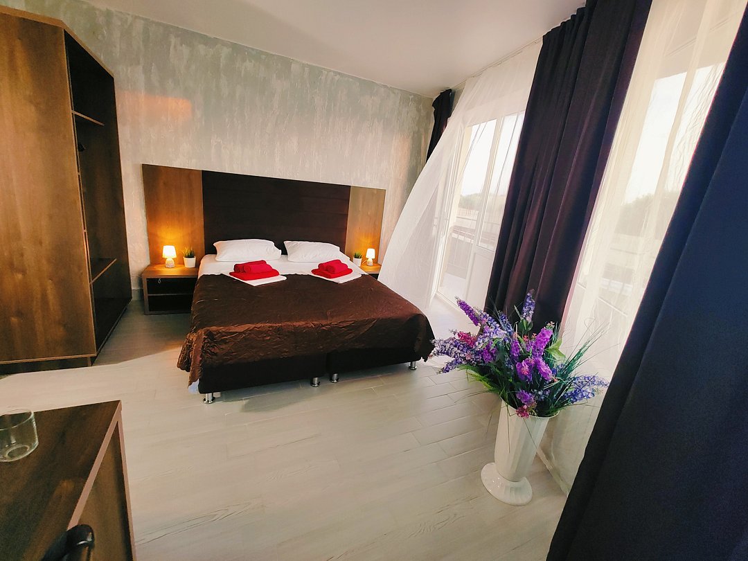 Двухкомнатный номер с террасой и видом на море с раздельным входом. В 1 комнате двуспальная кровать, во второй комнате комплектация спальных мест: двуспальная кровать и кресло-кровать. Для вашего комфорта в каждой комнате установлен: телевизор, кондиционер, доступен Wi-Fi, имеются шкаф для хранения вещей и прикроватные тумбочки, мини-холодильник, а также ванная комната в каждой комнате. Терраса оборудована зоной отдыха и подвесным креслом-коконом. Номер отлично подойдет для проживания семей с детьми или компаний друзей.