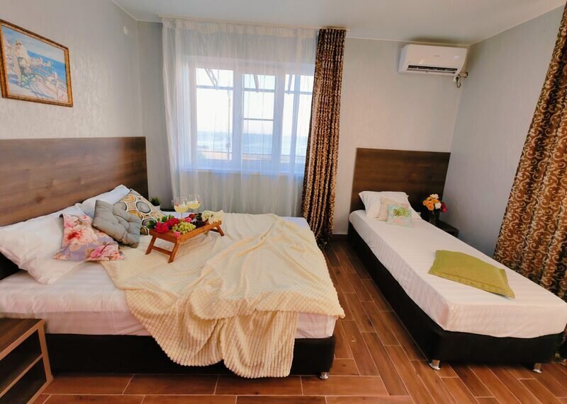 Прекрасный номер с видом на море для семьи или компании из трех человек. Номер оснащен: двуспальная кровать и кресло-кровать или двуспальная кровать и односпальная кровать, прикроватные тумбочки, стол, телевизор, кондиционер, мини-холодильником и Wi-Fi. Собственная ванная комната в номере.