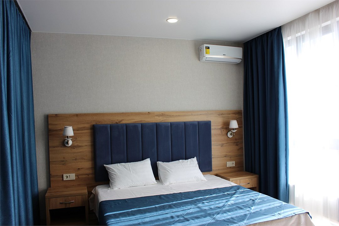 Корпус отеля разместился всего в 100 метрах от моря. Гостей ожидают вместительные апартаменты, оснащенные необходимой техникой и мебелью. В ванной комнате для отдыхающих подготовлены косметические наборы, есть фен. Среди услуг – высокоскоростной интернет, позволяющий всегда оставаться на связи. А в паре минут ходьбы – оборудованный песчаный пляж с раздевалками, теневыми навесами и шезлонгами.
