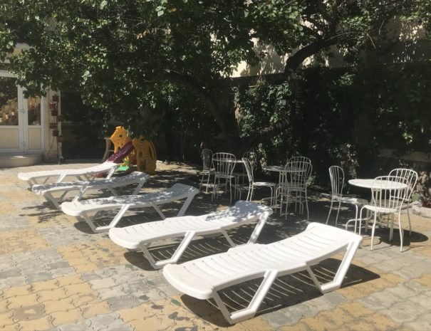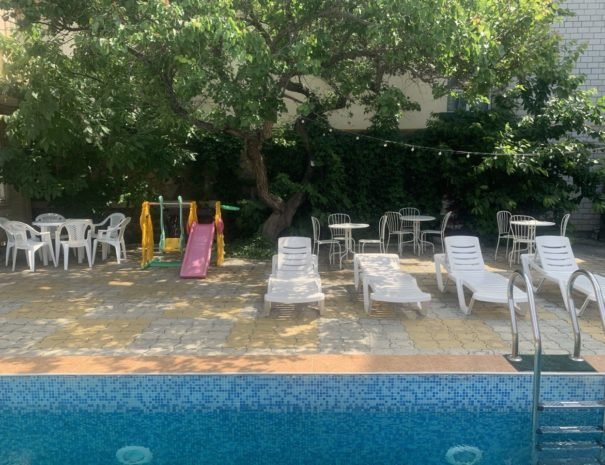 Гостевой дом «Атриум» представляет собой здание с закрытым двориком, бассейн с лежаками и столиками в тени красивых деревьев, сауной с крытым бассейном и детской площадкой.