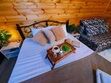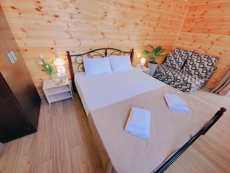 В номере: одна двуспальная кровать, двуспальный раскладной диван, прикроватные тумбы, прикроватные светильники, ЖК-телевизор, сплит-система, вешалка, шкаф.