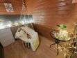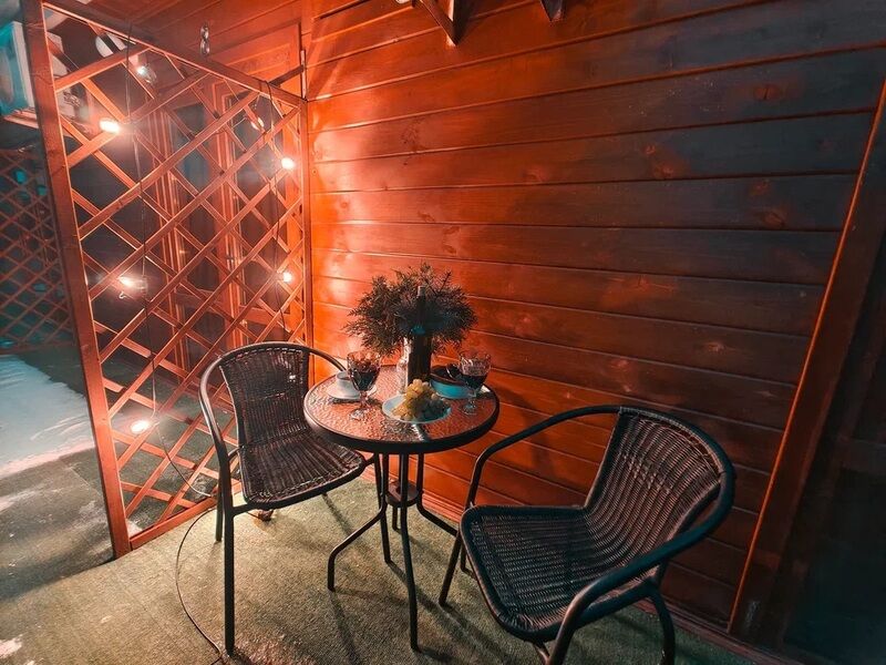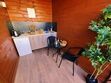 Крытая терраса с кухней: функциональный кухонный гарнитур, встроенный холодильник, электрическая плита, столовая посуда и приборы, столик и стулья.