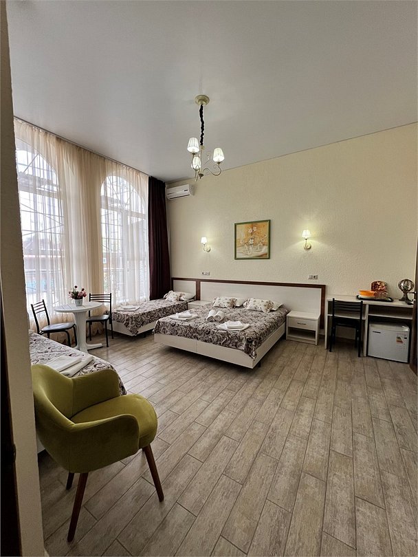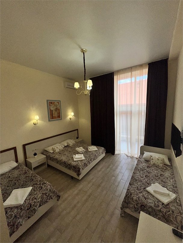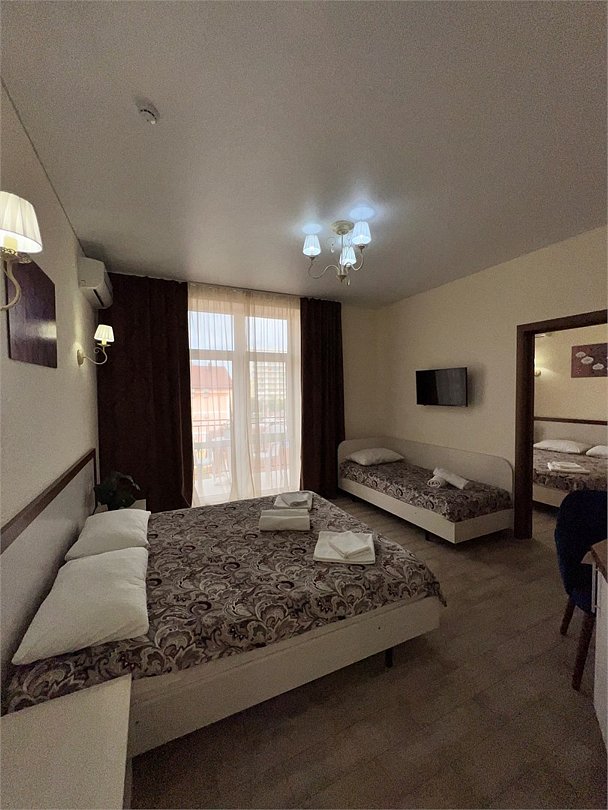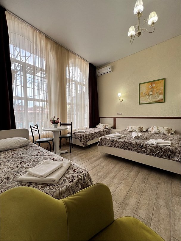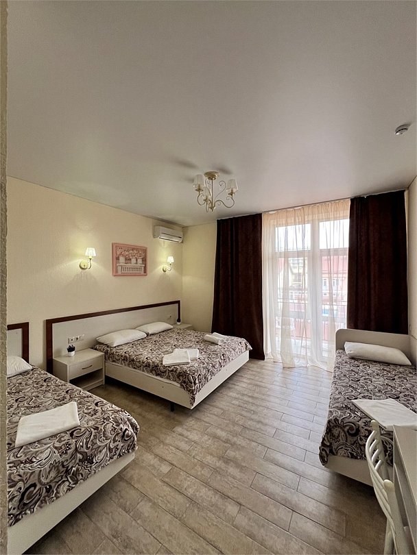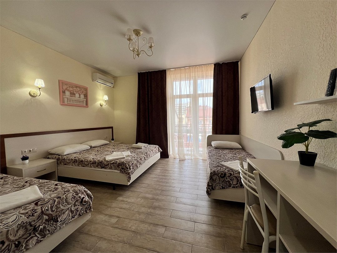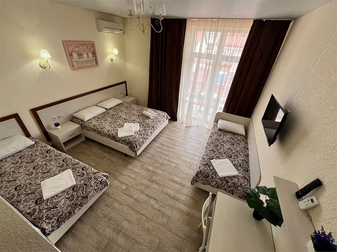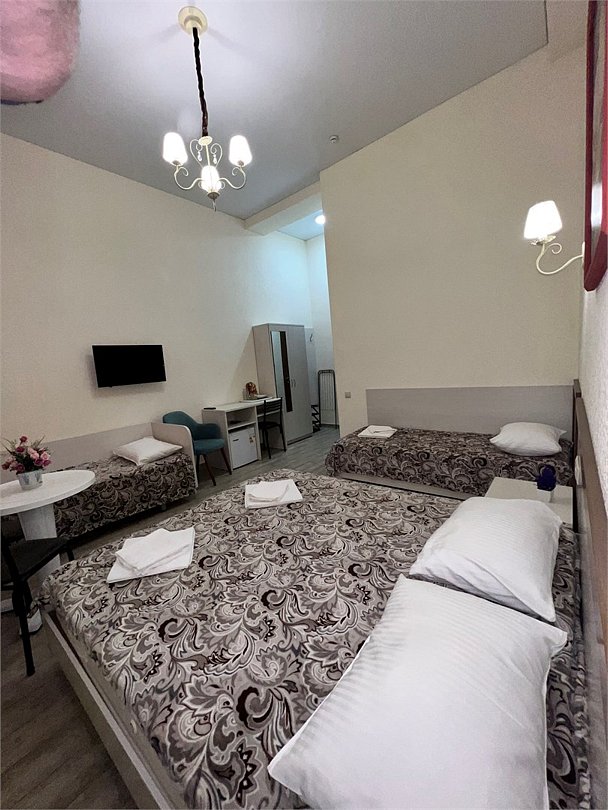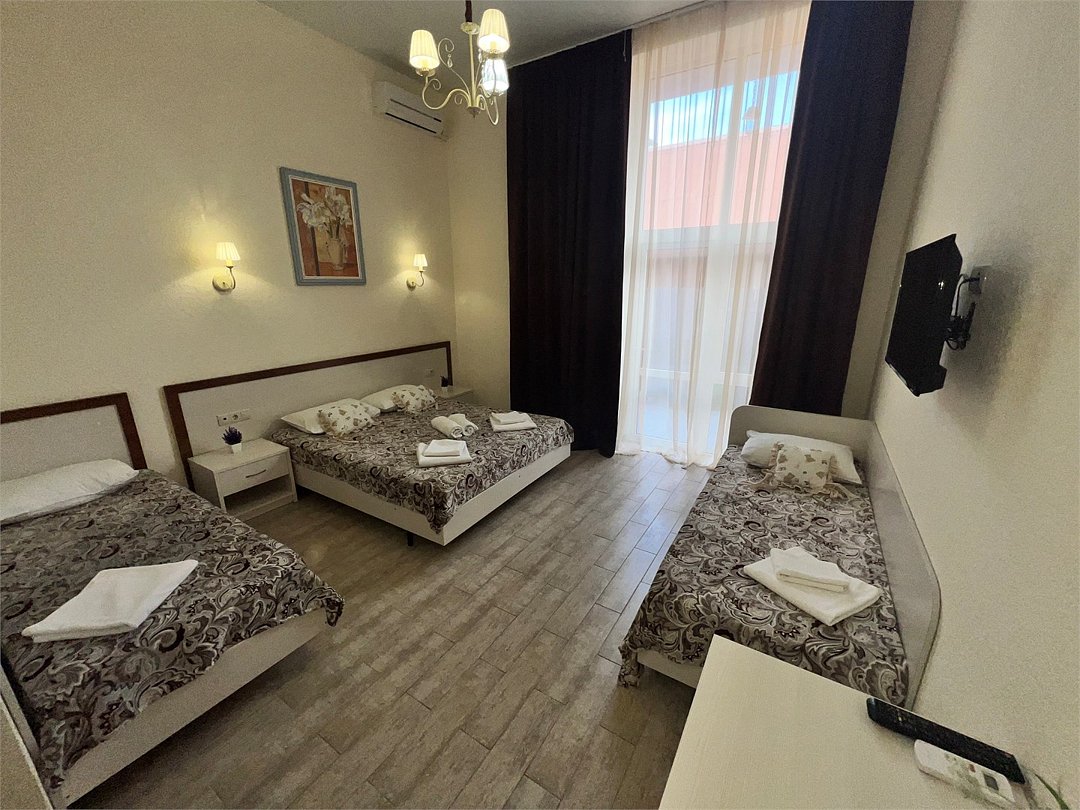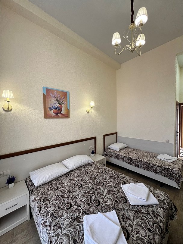 Номер площадью 22 м², размещение до 4 человек. Состоит из Тамбура, комнаты и санузла. Оснащен одной двуспальной кроватью и двумя односпальными кроватями, мини холодильник, телевизор, шкаф, прикроватные тумбы, стол, стулья, также различные полочки для удобства наших гостей и уличный набор для балкона Стол и два стула. В тамбуре мини прихожая. Есть собственная душевая комната с санузлом, фен, полочки, ершик, мыло, полотенца.Услуги и удобства