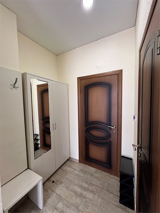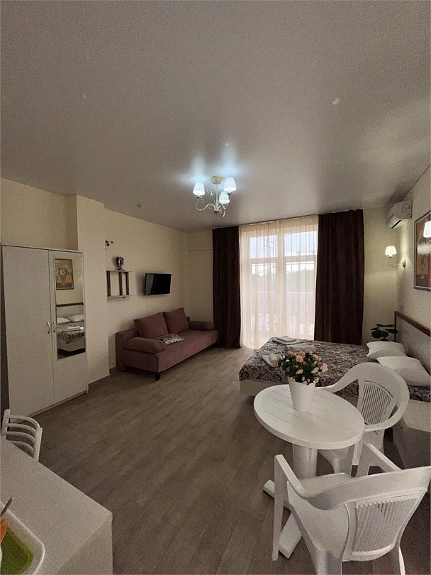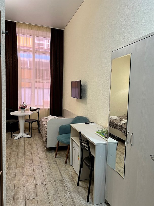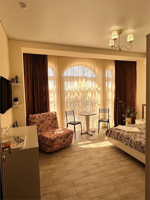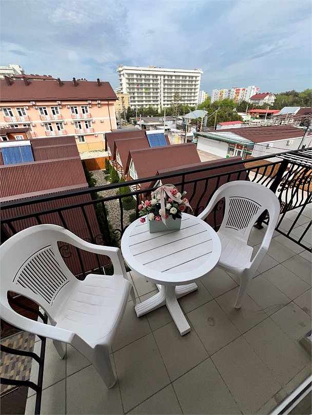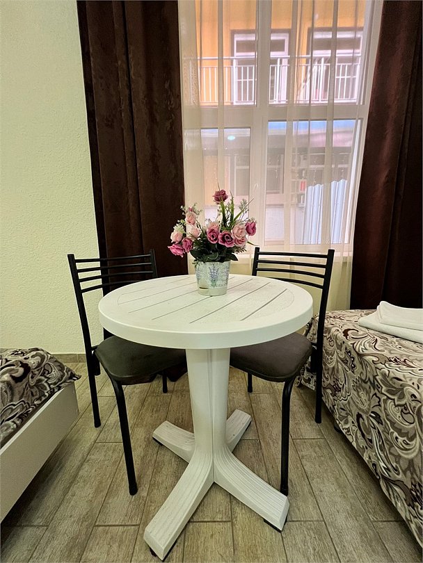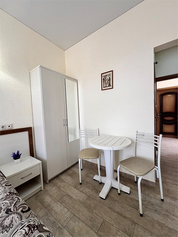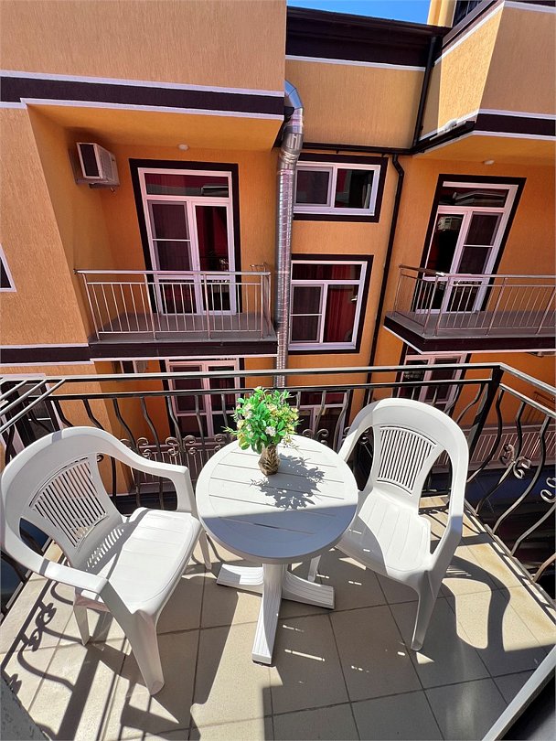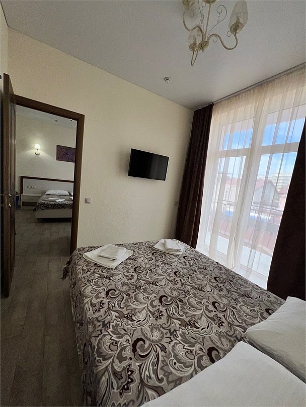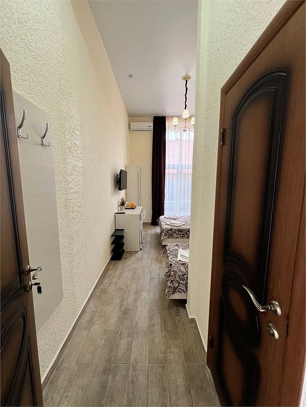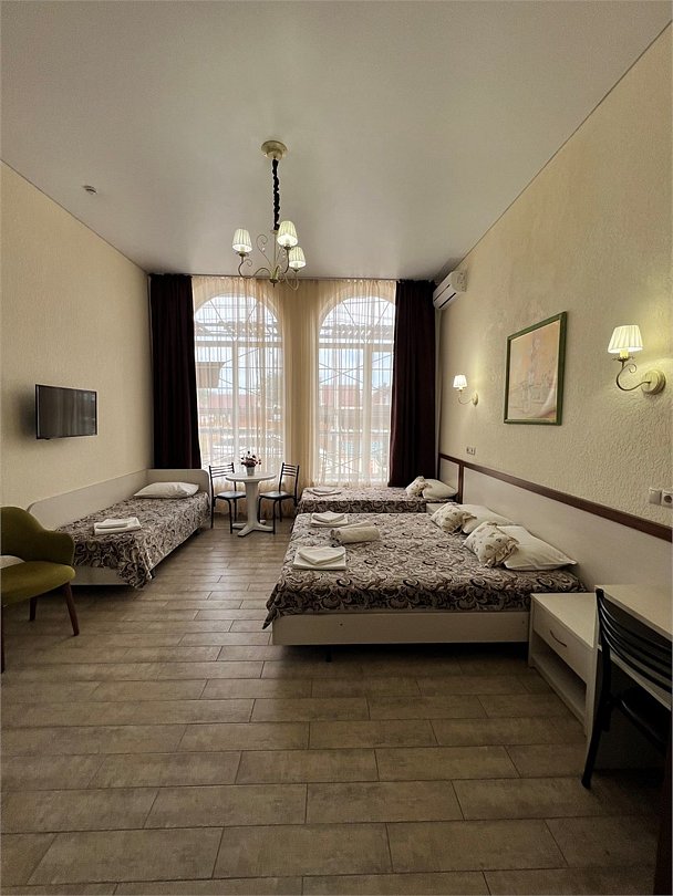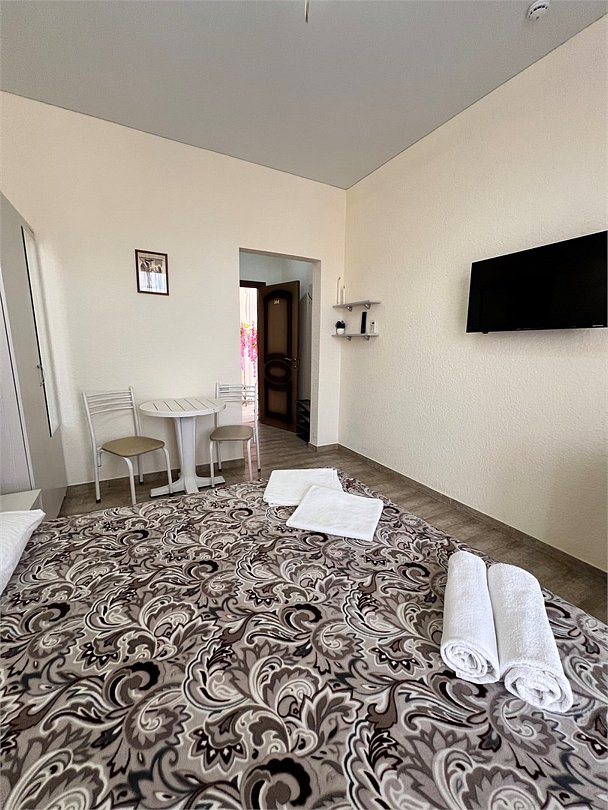 Номер площадью 22 м², размещение до 4 человек. Состоит из Тамбура, комнаты и санузла. Оснащен одной двуспальной кроватью и двумя односпальными кроватями, мини холодильник, телевизор, шкаф, прикроватные тумбы, стол, стулья, также различные полочки для удобства наших гостей и уличный набор для балкона Стол и два стула. В тамбуре мини прихожая. Есть собственная душевая комната с санузлом, фен, полочки, ершик, мыло, полотенца.Услуги и удобства
