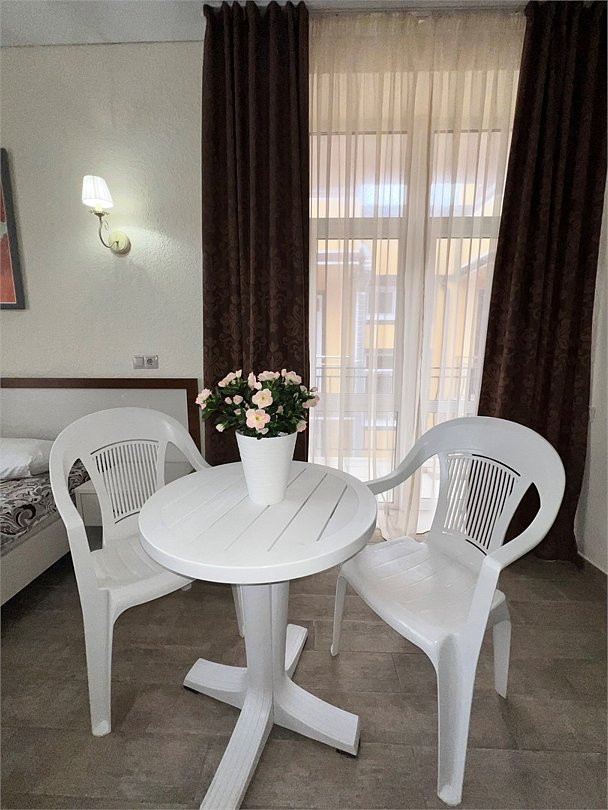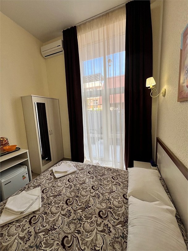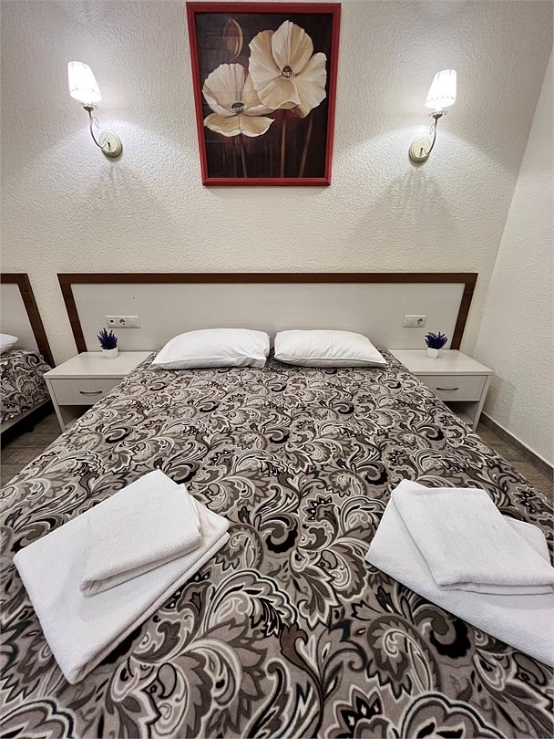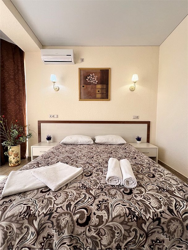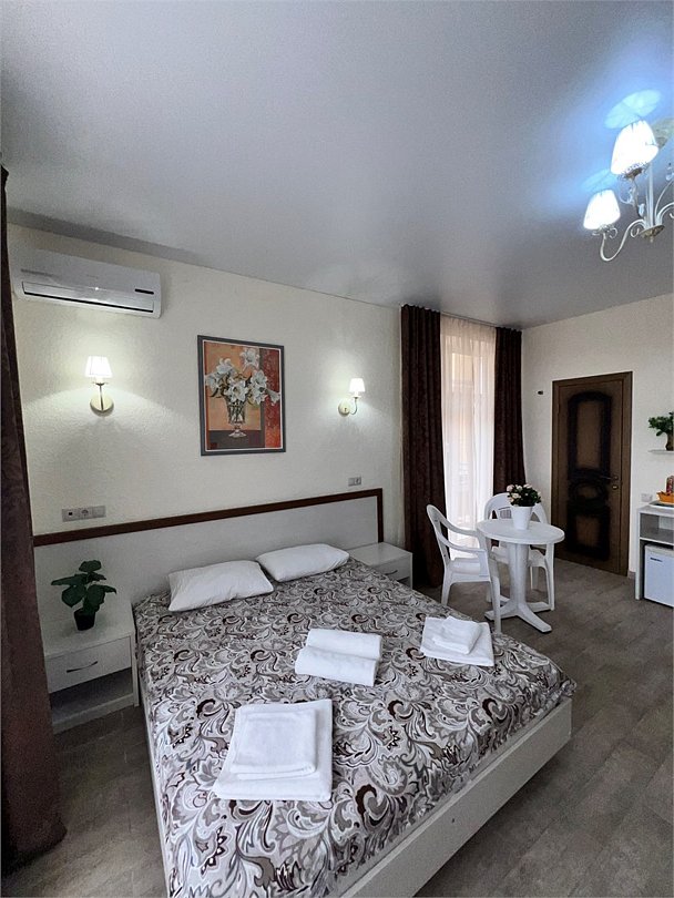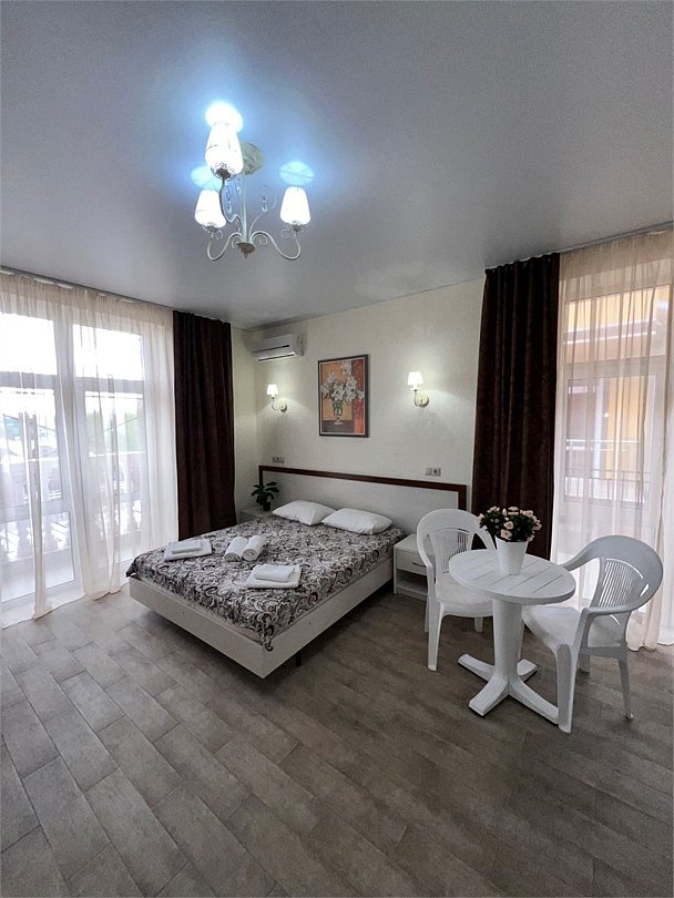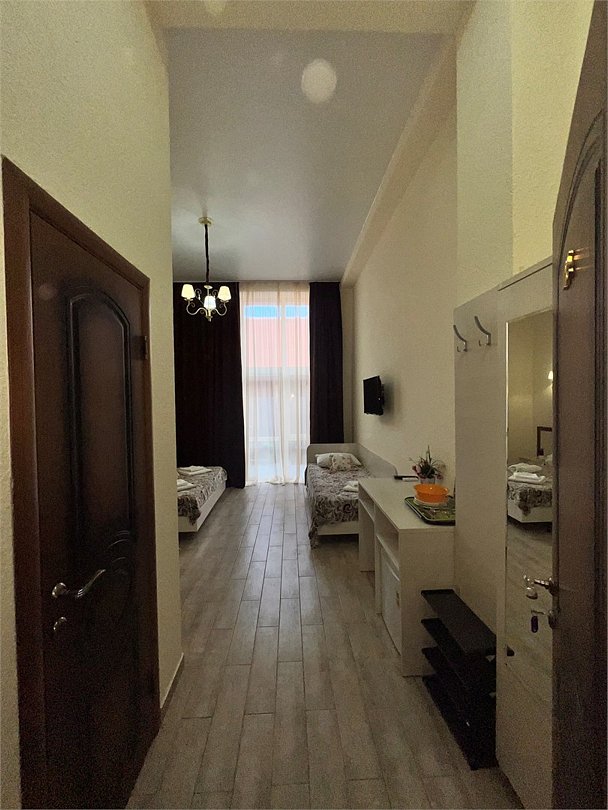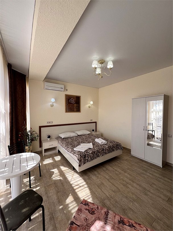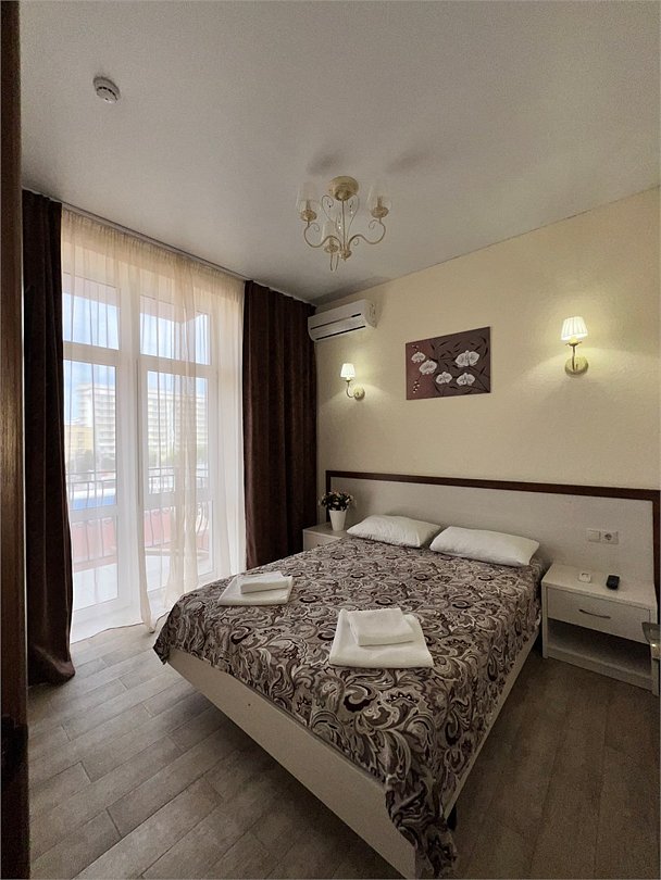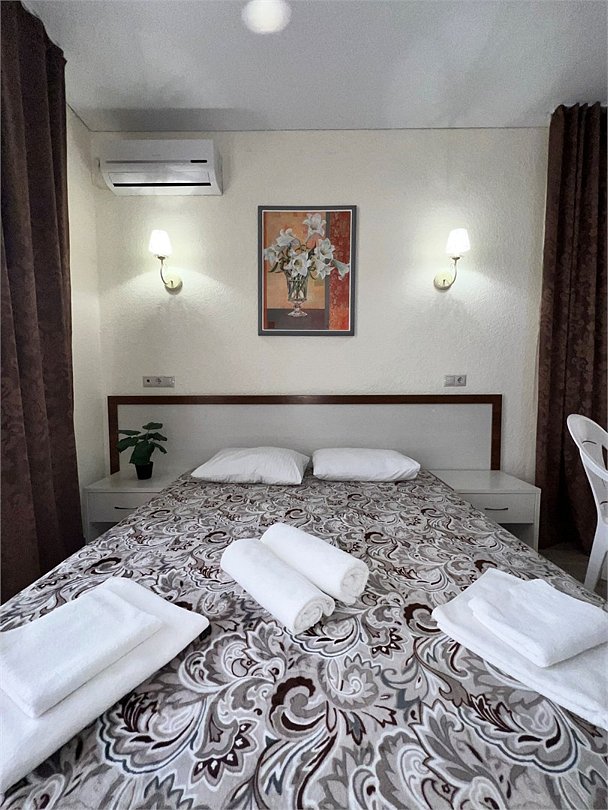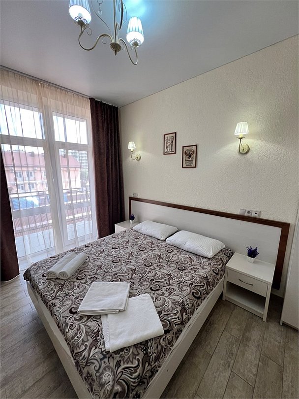 Номер площадью 27 м², размещение до 4 человека. Состоит из комнаты, санузла, и двух балконов. Оснащен одной двуспальной кроватью и двуспальный раскладной диван-кровать, мини холодильник, телевизор, шкаф, прикроватные тумбы, стол, стулья, туалетный столик также различные полочки для удобства наших гостей. Есть собственная душевая комната с санузлом, фен, полочки, ершик, мыло, полотенца.Услуги и удобства